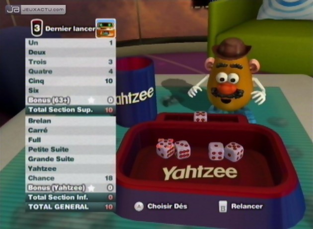 Comment s’en sortir quand on veut faire un jeu vidéo mais qu'on n'a pas d'idées ? Simple, il suffit d'aller fureter du côté des jeux de société, de polygoniser tout ça et d'en faire un jeu ! Ainsi après le récent Monopoly : Editions Classique et Monde, voici que Electronic Arts s’allie avec Hasbro pour continuer à décliner quelques boîtes célèbres sur consoles. En l'occurrence, on a même droit à une compilation de six titres : "Puissance 4", "Touché Coulé", "Yathzee", "Boggle", "Sorry!" et "Sorry! Sliders". Si les quatre premiers sont relativement bien connus de tous, les deux derniers ne vous disent probablement pas grand-chose. Dans "Sorry!", il s'agit en gros d'utiliser des cartes pour déplacer ses quatre pions sur le plateau et les amener à l'arrivée. Dans "Sorry! Sliders", on projette ses pions avec la Wiimote pour les faire glisser vers une cible centrale. En fonction des points obtenus, on s'approche de la victoire sur la carte de score, sachant que pour se retrouver sur l'arrivée, il faut le nombre de points exact. Autrement dit, il ne suffit pas de faire le plus gros score, il faut au contraire parfois ne pas projeter ses pions trop forts si on n'a besoin, par exemple, que d'un seul point pour gagner. Evidemment, j'ai résumé très simplement les règles mais le jeu proposer des instructions pour chaque jeu et affiche régulièrement des messages d'aide. Pour chaque titre, plusieurs variantes sont proposées, histoire de varier les plaisirs, justement. Alors évidemment, on peut jouer seul mais affronter la console ne présente qu'un faible intérêt. Tout l'intérêt du jeu réside dans le multijoueur, un à trois amis pouvant se joindre à vous selon la partie que vous voulez disputer. Techniquement, c'est plutôt bien fait, les commandes répondent bien, l'habillage est sympa également. A partir de là, c'est à vous de voir l'intérêt que vous voulez porter à cette compilation. Car le problème des jeux de société est que l'aspect convivial disparaît un peu quand on y joue à travers un écran. La bataille navale et le "Puissance 4" perdent beaucoup de leur fun tandis que le "Boggle" se montre plus "pratique" à jouer en vrai. D'où la note "moyenne" qui sanctionne ce test. D'un point de vue purement formel, Hasbro Best of des Jeux en Famille est bien fait. Concernant son gameplay, à vous de voir si les jeux proposés vous plaisent et si jouer avec vos amis devant une télé plutôt qu'autour d'une table ne vous dérange pas.