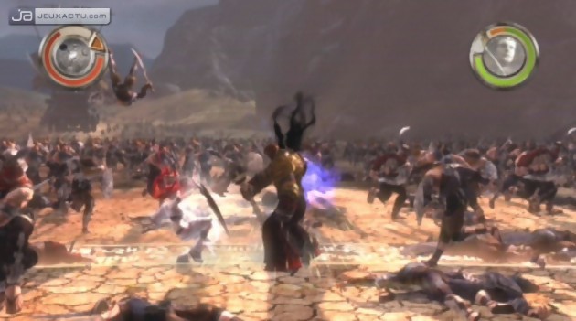 Toute la force d’un beat’em all moderne digne de ce nom repose bien évidemment sur son système de combat. Celui de Heavenly Sword reprend à peu de choses près celui de God of War dans la forme. En effet, à l’instar de Kratos, l’épée majestueuse de Nariko peut se transformer à tout moment en deux lames tranchantes qu’elle peut balancer pour découper ses ennemis à mi-distance. Plutôt pratique et esthétique quand on sait que Nariko peut en sus réaliser des figures aériennes d’une grande classe et de jongler avec ses deux lamelles métalliques. C’est peut-être la stance la plus efficace pour allier vitesse d’exécution et efficacité. Pour ceux qui préfèrent assassiner l’ennemi d’une seule frappe, Nariko peut se servir de son épée dans sa forme initiale. Tel un Siegfried en puissance, Nariko agite la Heavenly Sword avec une certaine lenteur mais les dégâts causés à l’ennemi sont bien plus importants, forcément. Pour atteindre les récalcitrants éloignés, il suffit au joueur de maintenir la touche L1 enfoncée pour que l’épée divine se transforme aussitôt en une lance virevoltante, permettant par la même occasion au joueur de profiter du spectacle offert par Nariko et ses talents de danseuse étoile. Le nombre d’enchaînement et de mouvements étant plutôt variés, Heavenly Sword évite ainsi au joueur de sombrer dans la répétition et la lassitude, défaut inhérent à ce type de jeu en particulier, la série des Dynasty Warriors de Koei peuvant en témoigner. On l’a vu à plusieurs reprises lors des salons et autres présentations, Heavenly Sword fait aussi la part belle aux QTE (Quick Time Event), ces séquences pré-calculés où le joueur est juste sollicité pour appuyer sur le bon bouton au moment opportun. Des passages qui ponctuent le gameplay de temps à autres et qui permet d’apporter un aspect cinématographique aux combats. Depuis que God of War a démocratisé ce type d’actions, tout beat’em all qui se respecte propose donc sa version des faits et celle de Heavenly Sword s’en tire avec les honneurs, offrant quelques passages d’anthologie. On aurait aimé par contre que les développeurs fassent preuve de moins de tolérance, afin que le challenge soit de taille. Car à moins d’avoir le regard tourné vers sa copine, il est assuré de pouvoir déclencher chacune de ces actions.