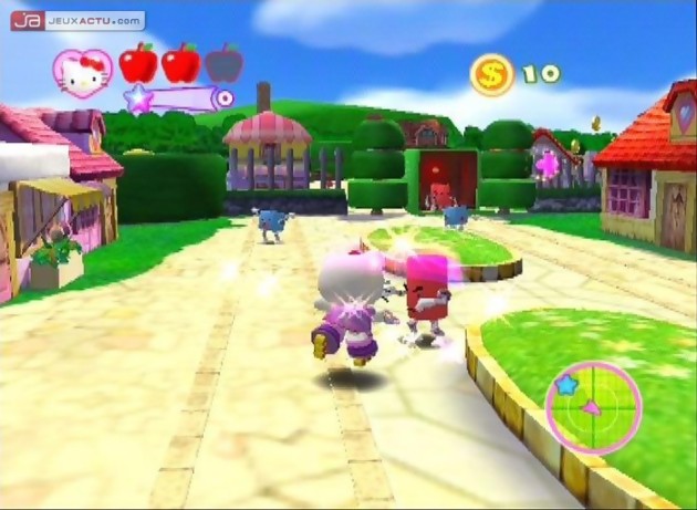 Qu’on se le dise, Hello Kitty : Roller Rescue est exclusivement destiné au jeune public et séduira plus particulièrement les petites filles grâce à sa boîte et sa jaquette rose bonbon. Difficile donc de l’apprécier, même pour les fans de la première heure, si l’on ne fait pas partie de cette catégorie. La trame scénaristique qui tient sur un ticket de métro nous raconte comment Kitty va sauver son village de l'assaut de méchants blocs de couleurs. Après avoir subi de nombreuses railleries suite à l'échec de sa conquête de l’univers, le roi des blocks jure de parvenir à ses fins et désigne la Terre comme sa prochaine cible. La ravissante Kitty doit donc enfiler son petit nœud et ses rollers pour ramener l’ordre dans son village. Dans sa maison familiale, on pourra consulter les objectifs de la prochaine mission, dépenser les pièces d’or pour en savoir plus sur l’histoire d’un personnage en particulier ou débloquer une cinématique, sauvegarder ainsi que changer à loisir sa garde robe. Egalement point de départ de chacune de vos missions, l’aventure nous entraînera par la suite dans des lieux tous aussi communs comme un parc d’attraction, la place d’un village ou encore le supermarché. Bien sûr, chaque mission peut se rejouer à l’infini afin d’améliorer son score par exemple ou récupérer encore des pièces d’or pour faire ses emplettes. Pour aider les plus jeunes, les parcours sont également fléchés et un radar indique la position du prochain objectif. De même, vous pourrez vous faire épauler par un de vos acolytes dès le niveau 4 mais il n’est possible à aucun moment de le contrôler. Enfin, tous les trois niveaux, un Boss viendra vous barrer la route. Si l’on en vient tout de même à bout aisément une fois que l’on a pris le coup, les Boss sont assez coriaces et pas forcément adaptés à l’usage des tous petits.