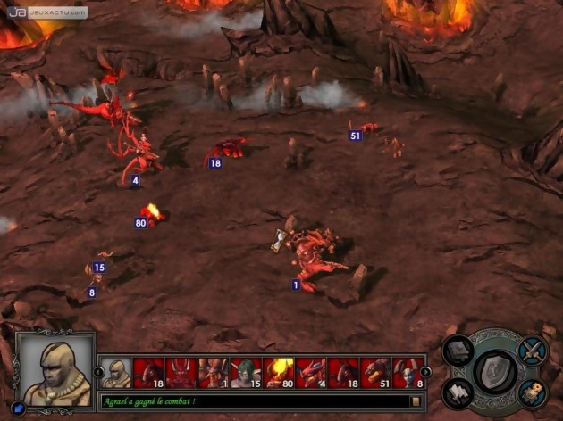 Globalement, chaque créature a la possibilité d'un certain nombre de case et peut attaquer le cas échéant à une unité adverse à proximité. Les dommages qu'il peut infliger sont proportionnels à ses statistiques d'attaque mais il y a tout de même un facteur de hasard assez important qui entre en ligne de compte. Ensuite, il y a également la chance et le moral de vos troupes qui influeront quelque peu en les obligeant à passer un tour dans le pire des cas ou de rejouer voire même de frapper le double de sa puissance. Enfin, la force de frappe et la défense de vos unités est également conditionné par l'expérience du héros qui participe également en personne au combat. Expérience. Le mot est lâché. En effet, votre héros passe régulièrement des niveaux en fonction de ses actions et améliorent ainsi d'un point une des caractéristiques suivantes : Attaque, Défense, Connaissance et Savoir. De plus, il pourra acquérir une nouvelle compétence ou renforcer son niveau de maitrise d'une autre préalablement acquise. L'arbre des compétences a été repensé et il faudra parfois en acquérir plusieurs pour pouvoir en débloquer une autre. Un héros ne peut apprendre qu'un nombre assez limité de compétence et seulement quatre choix sont proposés à chaque changement de niveau, il y a donc également une petite part de hasard dans le choix de sa voie. Ainsi, on doit varier de stratégie à chaque partie et la combinaison "qui déchire tout" n'a pas lieu d'être. Disposer de plusieurs héros secondaires peut ainsi sembler absurde pour les débutants puisque l'on partage ainsi l'expérience et divise son armée. Avec la pratique, cette alternative devient très stratégique puisque les héros secondaires pourront notamment servir au transport des unités du château jusqu'à votre héros principal ou seront tout simplement sacrifié pour évaluer avec exactitude les forces ennemies. Grosse nouveauté au niveau du gameplay, il est possible d'avoir le résultat d'un affrontement instantanément et si celui-ci n'est pas satisfaisant, vous pouvez alors le rejouer manuellement. On n'est jamais mieux servi que par soi-même. Mais il faut avouer qu'e cette option peut être bien pratique pour gagner quelques minutes en évitant un combat futile dont on est certain de sa victoire. Le combat automatique n'est franchement pas non plus (vous pouvez à tout moment reprendre les choses en main), l'intelligence artificielle étonne même, mais rien ne remplacera l'intelligence humaine dès que vous aurez assimilé les subtilités du jeu.