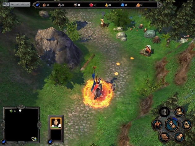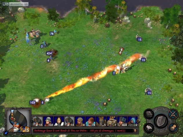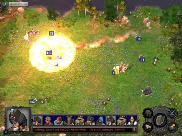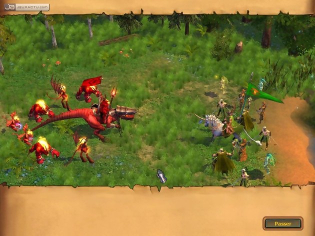 Globalement, chaque créature a la possibilité d'un certain nombre de case et peut attaquer le cas échéant à une unité adverse à proximité. Les dommages qu'il peut infliger sont proportionnels à ses statistiques d'attaque mais il y a tout de même un facteur de hasard assez important qui entre en ligne de compte. Ensuite, il y a également la chance et le moral de vos troupes qui influeront quelque peu en les obligeant à passer un tour dans le pire des cas ou de rejouer voire même de frapper le double de sa puissance. Enfin, la force de frappe et la défense de vos unités est également conditionné par l'expérience du héros qui participe également en personne au combat. Expérience. Le mot est lâché. En effet, votre héros passe régulièrement des niveaux en fonction de ses actions et améliorent ainsi d'un point une des caractéristiques suivantes : Attaque, Défense, Connaissance et Savoir. De plus, il pourra acquérir une nouvelle compétence ou renforcer son niveau de maitrise d'une autre préalablement acquise. L'arbre des compétences a été repensé et il faudra parfois en acquérir plusieurs pour pouvoir en débloquer une autre. Un héros ne peut apprendre qu'un nombre assez limité de compétence et seulement quatre choix sont proposés à chaque changement de niveau, il y a donc également une petite part de hasard dans le choix de sa voie. Ainsi, on doit varier de stratégie à chaque partie et la combinaison "qui déchire tout" n'a pas lieu d'être. Disposer de plusieurs héros secondaires peut ainsi sembler absurde pour les débutants puisque l'on partage ainsi l'expérience et divise son armée. Avec la pratique, cette alternative devient très stratégique puisque les héros secondaires pourront notamment servir au transport des unités du château jusqu'à votre héros principal ou seront tout simplement sacrifié pour évaluer avec exactitude les forces ennemies. Grosse nouveauté au niveau du gameplay, il est possible d'avoir le résultat d'un affrontement instantanément et si celui-ci n'est pas satisfaisant, vous pouvez alors le rejouer manuellement. On n'est jamais mieux servi que par soi-même. Mais il faut avouer qu'e cette option peut être bien pratique pour gagner quelques minutes en évitant un combat futile dont on est certain de sa victoire. Le combat automatique n'est franchement pas non plus (vous pouvez à tout moment reprendre les choses en main), l'intelligence artificielle étonne même, mais rien ne remplacera l'intelligence humaine dès que vous aurez assimilé les subtilités du jeu.