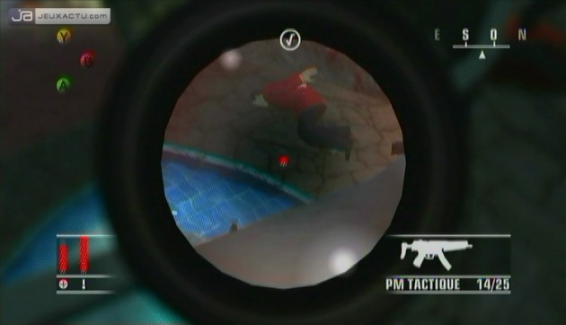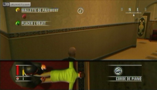 Evidemment, plus vous changez de vêtements, plus les cadavres s’amoncellent et il faudra ruser pour en évacuer un maximum. Soigneusement rangés dans un container ou balancés par-dessus une balustrade en faisant passer leur mort pour un simple accident, les techniques sont multiples. Mais une fois de plus, surveillez vos arrières et prenez garde aux caméras de surveillance qui pourraient vous jouer des tours faisant grimper le niveau d’alerte. D’ailleurs, une jauge à l’écran vous indique le taux de surveillance du niveau. Vert, jaune et rouge, pas besoin de vous faire un dessin pour en comprendre les aboutissements. N’hésitez donc pas à changer régulièrement de tenues ou à vous calfeutrer dans un placard histoire de réduire cette jauge. Cependant il vous sera parfois difficile de planquer correctement un macchabée. Vous le remarquerez grâce à un découpage de l’écran façon 24H Chrono. Ce multifenêtrage vous annoncera également les moments critiques ou propices d’une mission. Et comme on dit après l’heure, c’est plus l’heure auquel cas vous devrez réviser vos plans.