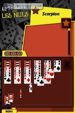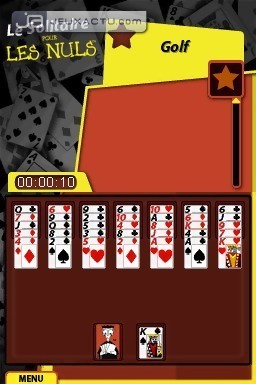 Bien connue des cancres en quête de remises à niveau ou des personnes désireuses de se cultiver avec légèreté, la collection "Pour les Nuls" se décline depuis peu sur des sujets de plus en plus variés, mais également, et c’est ce qui nous intéresse ici, en jeu vidéo. Mais contre toute attente, l’opus dont il s'agit aujourd’hui n’a pas pour vocation de nous éduquer sur une quelconque discipline que l’on suivait walkman aux oreilles au lycée, mais de nous occuper durant cette tant attendue période de grandes vacances. Jeux de Voyage pour les Nuls est effectivement une compilation de mini-jeux qui se vante de proposer plus de 600 casse-têtes en son sein. En réalité, derrière ce chiffre plutôt flatteur et crânement mis en avant sur la jaquette, vous pouvez tabler sur environ 500 grilles de Sudoku, un plateau d’échecs et une variété de dix Solitaires - dont le klondike à trois cartes démocratisé par Windows, le pyramide, l’accordéon, ou encore le fameux free cell. Pas de quoi sauter au plafond, d’autant que dans le style compilation, la DS dispose d’une carte invaincue pour le moment en la personne de 42 Jeux Indémodables, dont la sobriété et l’efficacité ne sont plus à prouver. Le minimum que l’on puisse demander à Jeux de Voyage pour les Nuls est heureusement assuré, la prise en main tactile ne souffrant pas d’imprécisions et différentes options pour le Sudoku (saisi du chiffre ou sélection sur une grille par simple clic) étant proposées. Rien n’est à déplorer non plus du côté de la représentation visuelle des différents jeux. Ce qui n’est pas forcément le cas des menus qui reprennent la direction artistique des bouquins. Autant dire que ce n’est pas bien beau et que les couleurs ne sont pas du meilleur goût. Heureusement que le tout reste parfaitement lisible et fonctionnel. En fait, ce qui gêne le plus avec Jeux de Voyage pour les Nuls vient de son manque d’originalité, de personnalité et de convivalité. Le titre d’Electronic Arts fait clairement figure de production alimentaire, ne se basant que sur son nom bien connu pour espérer se vendre par cartons. Même les échecs nous obligent à affronter l’ordinateur. Le seul aspect pédagogique que l’on était en droit d’attendre d’un jeu tiré d’une telle gamme vient ici des différentes règles - sobrement distillées dans les menus - et des entraînements durant lesquels une fonction d’aide apparaît pour nous accompagner dans notre apprentissage. Pas de quoi faire de l’ombre à la concurrence donc, et encore moins justifier un tel patronyme. Une petite section "Conseils et débrouillardise" n’aurait par exemple pas été de refus, avec des exemples de jeux de plage nécessitant trois cailloux et quelques participants pas forcément adeptes de farniente. Certes, la DS n’aurait servi à rien après nous avoir livré les instructions, mais au moins, la cartouche se serait montrée utile durant les vacances. Car autant être franc et réaliste : qui s’embêtera sur des passes-temps qui nous occupent à longueur d’année dans le RER ou au bureau, alors que le soleil ne demande qu’à rôtir nos fesses ?