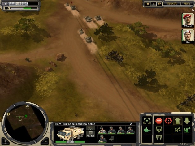 Comme dans Ground Control premier du nom, vous n’avez pas droit à l’erreur. Le moindre fantassin devra se trouver à sa place, combattre l’unité face à laquelle il est le plus efficace pour s’en sortir en vie et que votre petite armée possède la force de frappe la plus impressionnante possible. Sur chaque carte, les ennemis sont dix fois plus nombreux que vous, au bas mot. La moitié s’élimine assez facilement car de nombreuses unités patrouillent et demeurent plutôt isolés des camps adverses. Mais deux ou trois fois lors de la mission, vous tomberez sur des groupes plus dangereux ou résisterez à un assaut. Il faut obligatoirement créer des groupes et jouer les Mozart du clavier en balançant 10 ordres par seconde. Les combats demeurent assez brefs. Perdre plus de cinq unités s’avère en général une très mauvaise nouvelle. Heureusement, tout n’est pas complètement perdu. Contrairement à Ground Control qui ne permettait pas de renforcer ses troupes, il est parfois possible, dans certaines conditions, de demander des renforts. Tout d’abord, il faut avoir le cash. Ce cash s’obtient, et c’est l’excellente idée du jeu, grâce aux médias. Si les journalistes vous voient accomplir un acte de bravoure, comme protéger un camp de réfugiés, détruire la télévision de propagande ou empêcher le massacre de population civile, ils le filmeront et vous obtiendrez des crédits supplémentaires pour quelques engins ou fantassins. Si vous vous trouvez sur une carte contenant un aéroport et que vous vous en êtes emparé, en route pour les M1A2 ! Sinon, vous devrez vous contenter de rangers, snipers, toubibs… Et avec l’expérience acquise par les héros, des bonus apparaissent (meilleure visibilité, précision accrue…) et des options s’ouvrent également : tir de missile, bombardements. Bien entendu, tout a un coût.
