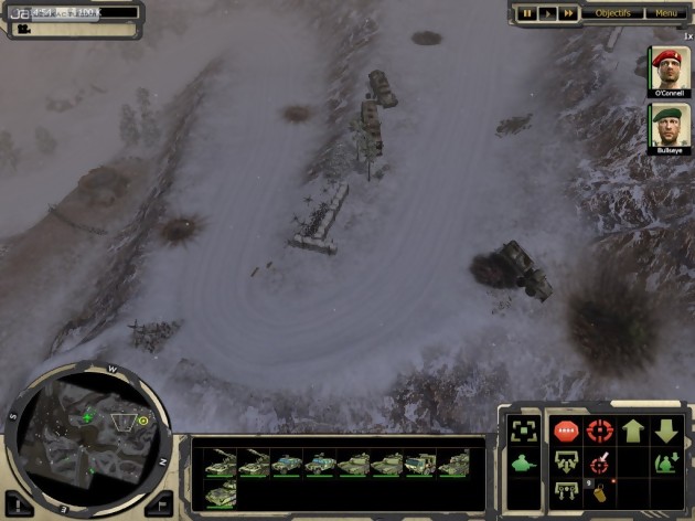 Toutes les missions bénéficient de suffisamment de rebondissements pour tenir le joueur en haleine des heures durant. Les choses se compliquent férocement à partir de la troisième campagne : la difficulté devient presque insurmontable et de plus en plus d’objectifs doivent se réaliser en un temps limité, empêchant ainsi des réparations de véhicules, par exemple. Mais le plus gros problème apparaît très rapidement. Le pathfinding est catastrophique. Non pas qu’une unité ne trouve pas le meilleur chemin : de ce point de vue là, cela reste assez supportable. Mais lorsqu’une petite armée d’une dizaine de véhicules doit se déplacer à un point précis, proche ou éloigné, et le grand cirque des conducteurs alcooliques commence. Ils ne vont pas tous prendre le même chemin, ce qui peut les mettre en danger et d’autres vont tout bonnement rester bloqués, même si la route est très large. En ne faisant pas attention, toute l’armée peut y passer. On finit par diriger les chars un par un sur des distances très rapprochés. Cela rappelle Dune II, c’est bon pour la nostalgie mais beaucoup moins pour les nerfs. Malgré ces défauts pour le moins gênants, on prend quand même du plaisir à avancer dans l’histoire car les cinématiques nous font découvrir un héros aux sentiments intéressants. Mais peu de joueurs iront au bout.