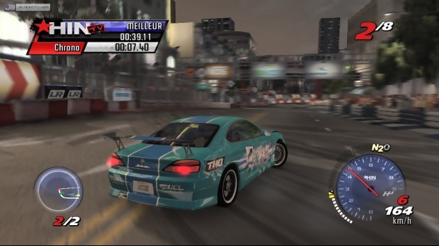Chaque championnat du mode Carrière comporte plusieurs courses, mais également plusieurs objectifs à accomplir. Gagner une course Eliminator, terminer un challenge de Drift Solo, terminer troisième dans une épreuve de Drift King, vaincre un pilote en particulier, rester trois secondes dans les airs - sauts cumulés -, voilà un exemple des défis à relever durant la compétition. Les courses jouent également la carte de la variété, avec la course Eliminator par exemple, dans laquelle le concurrent placé en dernière position est systématiquement éliminé à chaque tour. La course dite classique est bien sûr de la partie, et il faut simplement se contenter de finir premier. Le challenge Drift King, quant à lui, consiste à déraper tout le long d'un circuit avec les autres concurrents sur la piste. Il faut réaliser le meilleur score possible dans le temps imparti. A vrai dire, le drift de Juiced 2 : Hot Import Nights ne nous a pas totalement convaincus. Tout d'abord parce que ce n'est pas le joueur qui amorce le drift; il suffit de braquer le volant pour que la voiture se mette à déraper toute seule. Assez troublant au départ. Une fois la manoeuvre parfaitement assimilée, on réalise que le drift de Juiced 2 : Hot Import Nights ne prend pas suffisamment en compte le fait de doser l'accélération. Plus concrètement, jouer avec le stick suffit pour bien négocier les virages, sans forcément se focaliser sur la pédale d'accélération. On doit seulement remettre un coup d’accélérateur lorsque le véhicule ne dérape plus suffisamment. En course, le drift est utile pour gonfler sa jauge de nitro, atout indispensable pour distancer ses adversaires.