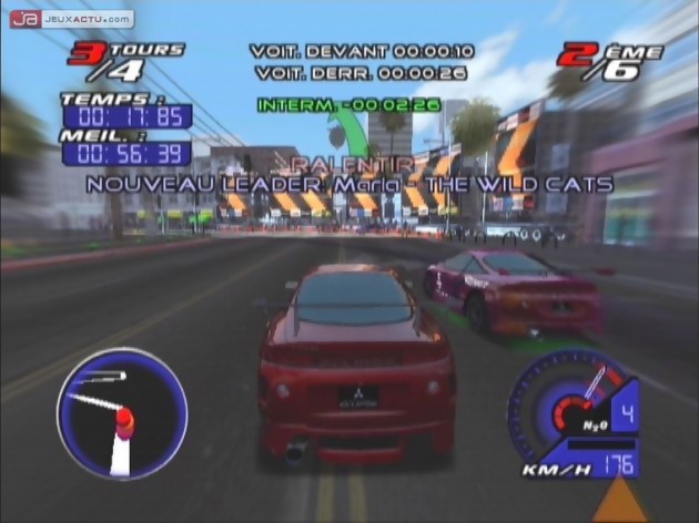 Mais Juiced n’est pas qu’un simple jeu de course, c’est un véritable casino ambulant. Avant chaque épreuve, vous pourrez parier de l’argent avec un adversaire, histoire de vous faire un peu de rab pour payer les réparations et les upgrades. Et si vous misez gros, vous pourrez même gagner le respect de vos concurrents. C’est ce même respect qui va alors vous permettre d’ouvrir de nouvelles possibilités avec les bandes adverses et d’étendre vos terrains de jeu. Selon vos performances et votre style en course, chaque chef de bande témoignera une variation de respect à votre égard, et ce n’est qu’une fois respecté que vous pourrez mettre des voitures en jeu pour gagner celle de votre adversaire. Attention toutefois, si les petits malins comptaient éteindre leur console juste avant la défaite, ce serait tout simplement un forfait et votre bel engin serait bel et bien perdu au profit d’une autre bande, de quoi s’immerger totalement et se prendre au jeu. Dans le cas d’une victoire, et c’est tout le mal qu’on vous souhaite, une nouvelle voiture, bien souvent déjà préparée viendra grossir votre garage. Selon le niveau de vos différents véhicules ainsi cumulés, vous pourrez alors accéder à de nouvelles épreuves réservées à certaines catégories de caisse. Mais se bâtir un empire mécanique ne se résume pas à humilier les autres en leur piquant leurs bolides, et bientôt vous pourrez, selon le contenu de votre garage, mais aussi selon votre équipe dont les rangs se grossissent au fur et à mesure, participer à des épreuves en bande, par groupe de deux ou de trois. Malheureusement, votre équipe vous tire souvent par le bas, et si chaque pilote progresse de course en course, il faudra concéder pas mal de défaites avant d’en faire des winners en série.