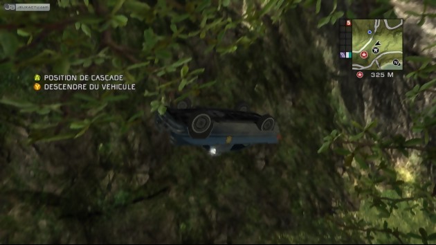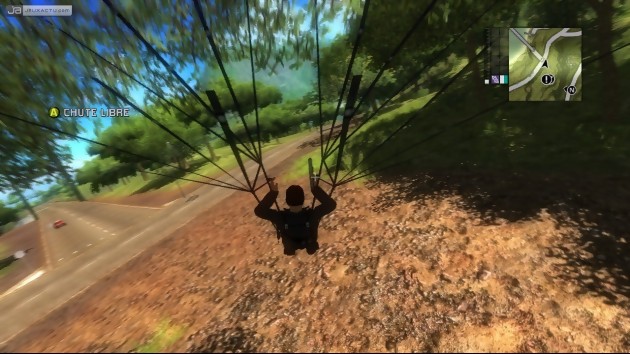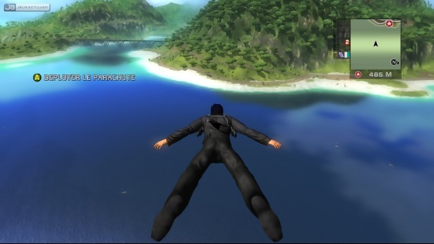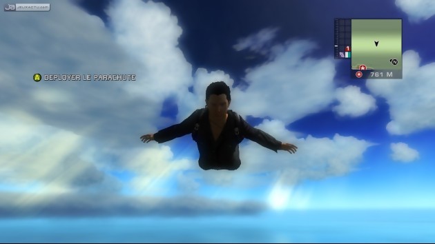 Lorsque vous planez au-dessus de San Esperito, Rico Rodriguez est toujours muni de son parachute de secours. Mais encore une fois, le plaisir de surplomber l’archipel se transforme en galère du fait de ne diriger qu’approximativement sa chute. Lente et monotone, on rangera rapidement son parachute pour piquer vers le sol la tête la première. La chute libre est vraiment très intéressante dans Just Cause mais si par malheur vous voulez dépliez votre parachute trop près de votre engin, vous allez en saisir la carrosserie et tomber irrémédiablement avec. Si à 300 mètres d’altitude, ce n’est pas grave, à 10 mètres du sol ça devient tout de suite plus problématique, et vous finirez comme une vieille crêpe séchée au soleil. Et puis dans ce florilège de cascades aériennes irréalisables mais tellement spectaculaires lorsqu’elles passent, il y a certains détails qui clochent comme le héros qui traversent les pales d’un hélicoptère sans se faire trancher façon chorizo ou un plongeon innocent de 3 kilomètres directement dans la mer qui ne réduit pas en bouillie notre Rico national.