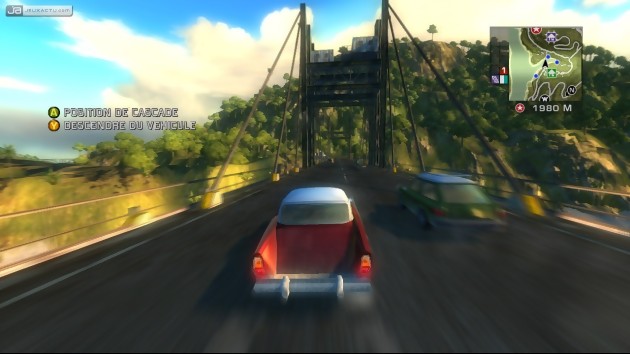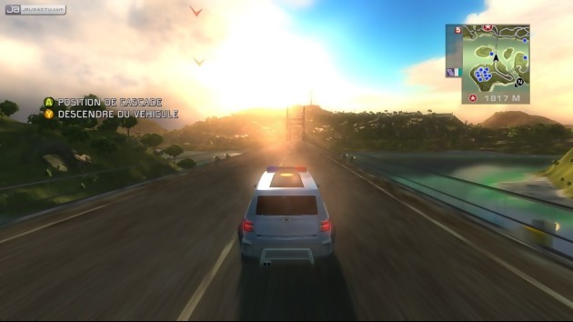 Dès lors qu’on opte pour la solution aérienne, on remarque les efforts des développeurs pour proposer des contrôles de véhicules différents. Si les engins à réaction ou à hélices se manient sans trop de problème pour peu qu’on ait le sens de l’orientation, le pilotage de deux roues et de bagnoles est un véritable calvaire doublé d’un supplice pour les oreilles. A l’image d’une tondeuse à gazon, les autos et les motos font un raffut d’enfer et en proposent la même conduite au sens où la moindre pression sur le stick analogique vous fait immédiatement zigzaguer. Il est très rare de réussir à maintenir une trajectoire droite que l’on soit à 200 km/h ou que l’on roule au pas. Ce gros problème de maniabilité nuit gravement à l’intérêt des bagnoles et une fois de plus on laissera tomber sa carte grise pour son permis bateaux, avions ou hélicoptères. Pour ces trois autres moyens de transports, presque rien ne vient perturber notre chevauchée fantastique… presque. Les développeurs de Just Cause nous proposent des phases de gameplay emprunt à Pursuit Force. C'est-à-dire que si vous avez l’âme d’un cascadeur, vous allez être servis ici. Sautez de véhicules en véhicules ou tentez le diable en plongeant d’un avion en plein vol, ça donne envie. Mais encore une fois le gameplay vient tout gâcher à cause d’une mauvaise configuration des boutons. Grosso modo, le Y permet d’entrer dans un véhicule et d’en sortir tandis que le A sert à s’accrocher à sa carlingue. Le B, quant est lui, est utile pour jumper sur un autre engin. Alors imaginez un instant que vous vous trompiez de touche et vous êtes bon pour vous rouler parterre laissant à l’abandon votre véhicule de croisière.