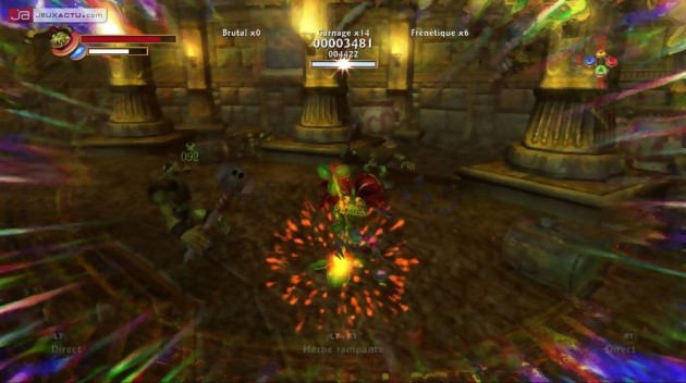 Tout cela donne à Kameo un gameplay réellement riche où l’action ne cesse de se renouveler. Dans les phases de combat pur, vous ferez de préférence appel à Frappedur le bien nommé qui, à force de directs et d’uppercuts, remplira une jauge qui, une fois pleine, vous permettra d’enclencher un mode semblable au bullet time. Vous pourrez alors assommer bon nombre d’orques et les reprendre de volée afin de faire perdurer cet effet. Plus fort encore, dans la peau de l’héroïne, vous aurez droit à des scènes parmi les plus spectaculaires jamais vues sur une console. Imaginez-vous chevauchant au milieu d’une bataille phénoménale opposant des milliers d’orques et humains avec des passages de dragons et des bombardements de catapultes en toile de fond, le tout sans aucun ralentissement à l’écran ! Ces phases sont absolument incroyables, à tel point qu’on est souvent tenté de faire demi-tour pour retraverser le champ de bataille de part en part alors que le devoir vous appelle en d’autres lieux. En parallèle à ces séquences d’action pure, il vous faudra également parfois réfléchir afin de débloquer une situation donnée. Face à un ennemi hors du commun, il faudra aussi employer certaines ruses et, si jamais vous veniez à coincer, votre livre/conseiller sera alors présent pour vous aider graduellement au fil de vos échecs. Le jeu reste, de ce fait, d’une difficulté très abordable, les joueurs attirés par les challenges plus élevés pouvant parfaitement bloquer l’aide. Mélangeant action, adresse, réflexion, vues à la première et à la troisième personne, Kameo ne fait vraiment l’économie d’aucun type de gameplay, le tout sans aucune baisse de rythme. Tout cela est bien servi par une maniabilité sans faille, sauf peut-être pour les phases sous-marines avec Grand Bleu sans que je sache si le problème venait de moi ou du jeu. Quoi qu’il en soit, même dans les zones les plus larges ou les plus étroites, le système de caméras ne pose jamais de souci, la jouabilité étant quasiment sans failles.