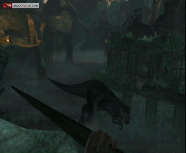 Bien évidemment, étant donné les partis pris de gameplay se pose alors la question de la précision de la visée. En pratique, cela fonctionne parfaitement puisqu’il est possible de contourner les problèmes éventuels en pointant son arme et de se servir du repère constitué par votre seconde main pour ajuster votre tir. Au cœur de l’action, par contre, vous n’avez pas le temps d’utiliser ce procédé mais le tir "à la volée" reste tellement intuitif que cela fonctionne également parfaitement. En toute honnêteté, j’ignore si un joueur peu rompu aux FPS aura la même précision que celles que vous et moi pouvons avoir mais là n’est pas l’essentiel, le jeu semblant assez tolérant de ce point de vue là. De plus, ne croyez pas que le fait de jouer Jack est comparable à un Turok, par exemple. Dans King Kong, on ne tue pas des centaines de dinosaures en avançant dans un espace ouvert, on vit une aventure ponctuée de rencontres dangereuses avec lesquelles vous allez devoir composer. Certes, votre chemin sera entièrement tracé mais l’immersion est telle que cela n’est pas gênant dans la mesure où vous vous laissez prendre au jeu. Comme je le disais donc un phrase plus tôt, face aux dinosaures, la seule force ne suffira pas, vous aurez beau vider un chargeur sur un T-Rex, cela ne l’empêchera pas de vous croquer, les différentes morsures déformant vos sens et accélérant votre rythme cardiaque. Il va donc falloir bien souvent ruser et utiliser à bon escient votre environnement. Cela passera, par exemple, par l’utilisation du feu ou des petits animaux (insectes, vers, poissons) que vous pouvez croiser. Je vous laisse découvrir cela afin de ne pas vous gâcher le plaisir mais sachez qu’il existe bien souvent plusieurs façons de faire face. D’autre part, King Kong fait partie de ces rares jeux où le joueur est amené à fuir. Là où le héros de jeu vidéo, reclus dans son archétype, brave tous les dangers au péril d’une de ses infinies vies, celui conçu par Michel Ancel n’hésite pas à s’échapper face à une menace insurmontable, tout en couvrant sa fuite, bien évidemment. Tout cela offre bon nombre de phases de jeux mémorables mais, encore une fois, je vous laisse les découvrir et les vivre par vous-même. Cela est d’ailleurs l’occasion d’une transition évidente vers la deuxième personnalité du jeu, dont l’apparition est l’occasion d’une fabuleuse scène qui se permet de jouer sur la lenteur, le véritable roi de Skull Island : Kong.