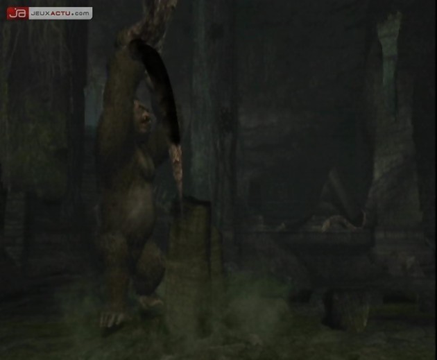 Alors, certes le jeu est parfois extrêmement linéaire et dirigiste mais c’est indéniablement le prix à payer pour qu’il reste aussi prenant. Il est à regretter cependant que c’est pendant certaines phases de déplacement avec Kong que le frame-rate subisse un sérieux coup de fatigue, ralentissant l’animation aux limites du tolérable. C’est d’ailleurs là un des rares critiques d’ordre technique qu’il est possible d’adresser au jeu qui, même sans être particulièrement bluffant, assure correctement sa contribution au spectacle. King Kong a peut-être les épaules un peu trop carrées mais là n’est pas l’essentiel. Ce qui importe davantage est l’évolution de notre rapport au grand singe, car même si l’empathie est, par nature, différente de celle que l’on éprouve pour Jack, peu à peu, son amour pour la belle Anne va poindre et nous rapprocher de lui. Sans céder à l’anthropomorphisme ni le romantisme rose bonbon, Michel Ancel arrive, par petites touches, à faire évoluer nos rapports au personnage, évident pendant animal de Jack. C’est là d’ailleurs une des grandes forces de King Kong : imprimer de l’émotion, qui plus est dans un jeu à licence. On passe par des phases d’émerveillement (une traversée de dinosaures devrait vous marquer) à la crainte jusqu’à la tristesse, elle-même générée par l’affection pour les protagonistes. Que cela se fasse dans un jeu destiné, a priori, à un public très large, est d’autant plus remarquable.