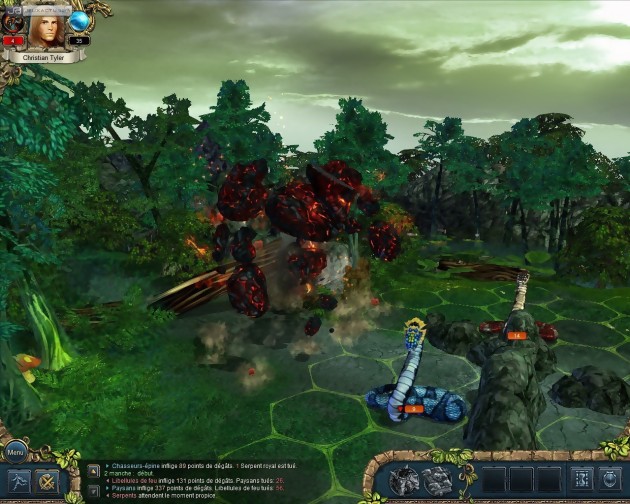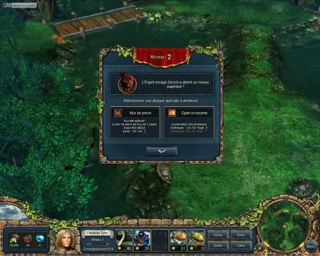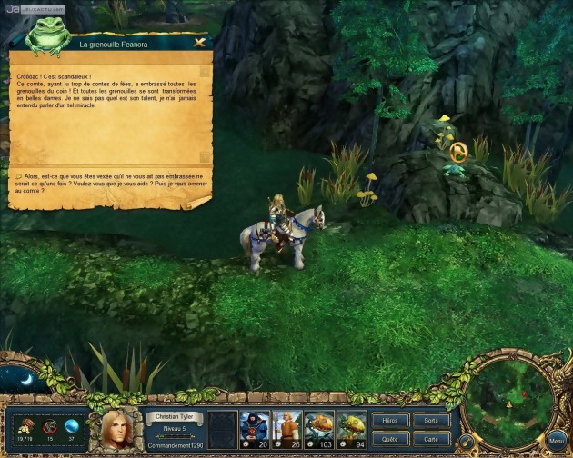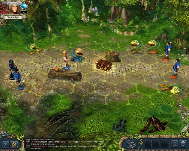 Comme dans la plupart des hack & slash, le développement du héros s'effectue à travers trois arbres de compétences (puissance, esprit, magie) qui influent grandement sur ses capacités. Naturellement, les objets d''inventaire revêtent également une certaine importance. Plus étonnant, ils se voient secondés par la possibilité de se marier et d'engendrer des enfants ! Avoir une femme apporte un bonus (qui dépend de la donzelle en question) et quatre cases d'inventaire supplémentaires... qui au final pourront être occupées par les descendants, également sources de bonus. Si l'envie vous en prend, vous pourrez même divorcer et abandonner tout ce beau monde, pour mieux recommencer avec une autre ! Mais attention, la femme délaissée emmène non seulement sa progéniture, mais également un cinquième de votre or... Les développeurs ne manquent manifestement pas d'humour ! D'ailleurs, ils assument sans sourciller tous les clichés de l'heroïc-fantasy, et les détournent même régulièrement au profit de situations qui font souvent mouche. Riches, nombreux et bien écrits, les dialogues ne manquent pas de piquant et permettent même parfois de résoudre certaines quêtes autrement que par le combat. On n'en attendait pas tant ! Hélas, ces dialogues se voient quelque peu malmenés par une traduction en dents de scie qui, si elle assume globalement plutôt bien le flot de textes, se prend régulièrement les pieds dans le tapis. Outre les "inévitables" fautes de frappes, d'orthographe ou de grammaire, on y trouve également quelques incohérences (un personnage appelé une fois Iron Richard , une fois Richard Dacier, la "boîte enragée" qui devient parfois la "boîte de rage"...). Et, tel un furoncle sur le nez d'une jolie princesse, le comble est atteint avec la traduction erronée de "turn" en "tourner". "Tourner 1", "Tourner 2" affiché en gros à chaque nouveau tour de jeu, ça la fout un peu mal...