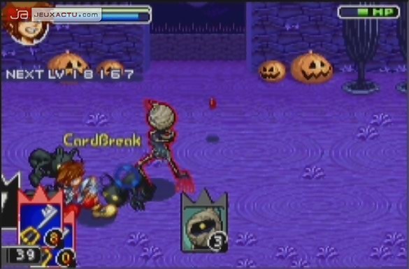 Si Kingdom Hearts : Chain of Memories commence fort avec une cinématique en 3D inégalée sur la portable mono-écran de Nintendo, les graphismes du jeu sont à la hauteur de cette prouesse technique qui nous a mis l’eau à la bouche. Tentant un mix original entre jeu de rôles et jeu d’action, ce nouveau Kingdom Hearts alterne en effet entre des décors en 3D isométrique parfaitement rendus et des écrans 2D magnifiques pour les scènes de combat. C’est simple, Chain of Memories est tout simplement bien plus beau que la plupart des jeux DS actuels. Toujours accompagné de ses désormais fidèles acolytes Dingo et Donald, Sora part à la recherche de sa mémoire après une vision pour le moins étrange. Ayant de plus en plus de mal à décerner la réalité du sublimé, notre jeune héros devra combattre contre ceux qui barreront son chemin, mais aussi et surtout contre ce qu’il pense être sa propre mémoire. Heureusement, il ne sera pas seul dans cette bataille et, au-delà de Dingo et Donald, de précieux alliés sortis tout droit des célèbres univers qu’il devra parcourir, viendront l’épauler. A coté des célèbres Hercules, Aladin, Peter Pan, la Bête et autres Pinocchio sortis des grands succès de Disney, Sora pourra également compter sur le charismatique Jack délogé de son incontournable Noël du génialissime Tim Burton. Mais au-delà de son ambiance enchanteresse, c’est le gameplay particulier qui confère au jeu sa touche si particulière.