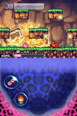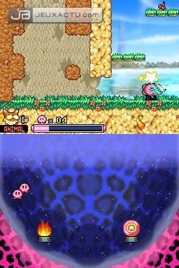Les fans du premier opus DS peuvent aller se rhabiller. Ici, on n’oublie tous les acquis de 2005, et on reprend les bonnes recettes vieilles de plus d’une décennie. Kirby : Mouse Attack est ce qu’on peut appeler un retour aux sources. S'il est regrettable que les développeurs aient amorcé ce virage à 180 degrés, avouons néanmoins que malgré l’intermède Kirby : Le Pinceau du Pouvoir, ils ont entièrement gardé leur savoir-faire. Notre boule rose se révèle toujours aussi agréable à manier, ce qui est tout de même un élément fondamental dans un jeu de plates-formes. Le titre développé par HAL Laboratory est cependant d’un classicisme vraiment effrayant. Kirby, notre petit personnage tout rond tout rose a ici retrouvé ses membres, plus besoin donc de le guider à la pointe de notre stylet. Stylet d’ailleurs qu’on aura tôt fait de ranger dans l’emplacement prévu par la console. Si l’ami Kirby a retrouvé ses bras et ses jambes, il a aussi récupéré l’intégralité de sa force, celle qui a fait toute la renommée de la série et celle à la base de ce gameplay particulier, gober ses ennemis pour pouvoir profiter de leurs compétences. En plus des classiques pouvoirs élémentaires, on en trouvera d’autres beaucoup plus originaux voire insolites. Kirby pourra jouer au magicien, à Ryu de Street Fighter et même à l’elfe le plus connu du jeu vidéo, Link. Ajoutez à cela des pouvoirs qu’on obtient uniquement en fusionnant deux items, comme par exemple l’épée et le feu qui donne… l’épée de feu, et ce n’est pas loin d’une trentaine de choix qui s’offre à vous. Cette grande diversité n’influera malheureusement que très peu sur votre parcours, si certains types d’attaques sont plus efficaces en fonction des boss, vous vous en tirerez en général sans problème quelques soit le pouvoir utilisé. Reste que certaines compétences précises permettront de déclencher des mécanismes ou d’accéder à certains endroits. Soit.
