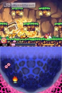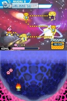 Les fans du premier opus DS peuvent aller se rhabiller. Ici, on n’oublie tous les acquis de 2005, et on reprend les bonnes recettes vieilles de plus d’une décennie. Kirby : Mouse Attack est ce qu’on peut appeler un retour aux sources. S'il est regrettable que les développeurs aient amorcé ce virage à 180 degrés, avouons néanmoins que malgré l’intermède Kirby : Le Pinceau du Pouvoir, ils ont entièrement gardé leur savoir-faire. Notre boule rose se révèle toujours aussi agréable à manier, ce qui est tout de même un élément fondamental dans un jeu de plates-formes. Le titre développé par HAL Laboratory est cependant d’un classicisme vraiment effrayant. Kirby, notre petit personnage tout rond tout rose a ici retrouvé ses membres, plus besoin donc de le guider à la pointe de notre stylet. Stylet d’ailleurs qu’on aura tôt fait de ranger dans l’emplacement prévu par la console. Si l’ami Kirby a retrouvé ses bras et ses jambes, il a aussi récupéré l’intégralité de sa force, celle qui a fait toute la renommée de la série et celle à la base de ce gameplay particulier, gober ses ennemis pour pouvoir profiter de leurs compétences. En plus des classiques pouvoirs élémentaires, on en trouvera d’autres beaucoup plus originaux voire insolites. Kirby pourra jouer au magicien, à Ryu de Street Fighter et même à l’elfe le plus connu du jeu vidéo, Link. Ajoutez à cela des pouvoirs qu’on obtient uniquement en fusionnant deux items, comme par exemple l’épée et le feu qui donne… l’épée de feu, et ce n’est pas loin d’une trentaine de choix qui s’offre à vous. Cette grande diversité n’influera malheureusement que très peu sur votre parcours, si certains types d’attaques sont plus efficaces en fonction des boss, vous vous en tirerez en général sans problème quelques soit le pouvoir utilisé. Reste que certaines compétences précises permettront de déclencher des mécanismes ou d’accéder à certains endroits. Soit.