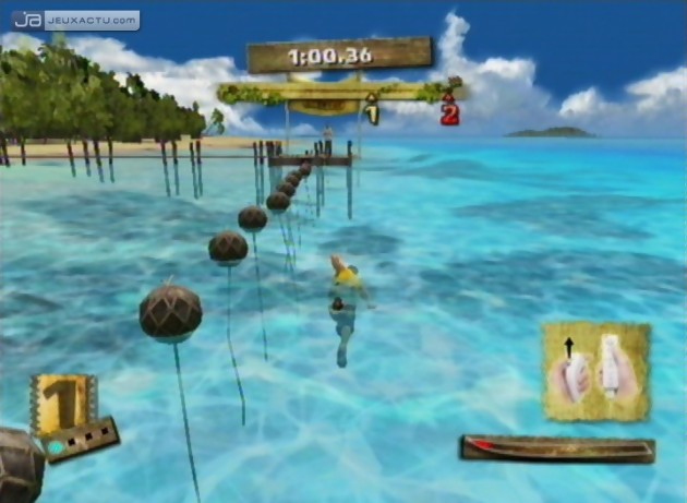 Clairement, non. Contrairement à ce que l’on aurait pu penser, Mindscape ne s’est pas laissé tenter par un Lost in Blue-like qui aurait sied à merveille avec le principe de l’émission. En lieu et place, nous avons droit à une sorte de party game qui nous demande d’enchaîner les épreuves de confort et d’immunité sans aucun lien ni aucune logique. Les premières sont censées nous conférer un avantage (nourriture, objet…) sur le jeu qui suit, bien que dans les faits, il est impossible de mesurer les apports d’une victoire. En revanche, perdre l’immunité sanctionne immédiatement notre équipe, un membre étant contraint de quitter l’aventure à l’issu d’un Conseil aux décisions obscures. En cas de succès, le jeu nous offre en revanche la possibilité d’éliminer un adversaire du camp adverse, tout en nous précisant la nature du challenge suivant, et les spécialités de chacun de nos opposants. De quoi nous offrir un petit avantage théorique un brin fourbe. Les 24 épreuves plus ou moins inspirées se suivent jusqu’à la fatidique épreuve des poteaux, sans aucune réunification, sans aucun candidat en souffrance contraint de quitter l’aventure, sans aucun accrochage verbal, ni même aucune famine à rassasier par une cuillère de riz pas cuit. Bref, sans l’essence même de Koh-Lanta. Pourtant la présence de Denis Brogniart en maître de cérémonie et de Christelle, la gagnante de la dernière édition, aurait pu apporter un semblant d’immersion bienvenu, mais en s’évertuant à modéliser le plus fidèlement du monde la poitrine de cette dernière, les développeurs en ont oublié l’essentiel : proposer une réalisation et un gameplay digne de ce nom. Le jeu laisse clairement un goût d’inachevé avec son moteur physique à deux francs six sous et sa prise en main trop perfectible pour être qualifier de réussie. Dans ces circonstances, difficile de trouver un semblant de fun. Si certains défis se relèvent sans trop de problème (tir et course, notamment), d’autres se montrent en revanche moins dociles comme les fouilles ou les phase en pirogue qui souffre davantage de ce manque incontestable de finition. Et même l’argument du Wii Balance Board ne pourra faire diversion.