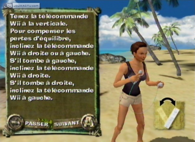 Clairement, non. Contrairement à ce que l’on aurait pu penser, Mindscape ne s’est pas laissé tenter par un Lost in Blue-like qui aurait sied à merveille avec le principe de l’émission. En lieu et place, nous avons droit à une sorte de party game qui nous demande d’enchaîner les épreuves de confort et d’immunité sans aucun lien ni aucune logique. Les premières sont censées nous conférer un avantage (nourriture, objet…) sur le jeu qui suit, bien que dans les faits, il est impossible de mesurer les apports d’une victoire. En revanche, perdre l’immunité sanctionne immédiatement notre équipe, un membre étant contraint de quitter l’aventure à l’issu d’un Conseil aux décisions obscures. En cas de succès, le jeu nous offre en revanche la possibilité d’éliminer un adversaire du camp adverse, tout en nous précisant la nature du challenge suivant, et les spécialités de chacun de nos opposants. De quoi nous offrir un petit avantage théorique un brin fourbe. Les 24 épreuves plus ou moins inspirées se suivent jusqu’à la fatidique épreuve des poteaux, sans aucune réunification, sans aucun candidat en souffrance contraint de quitter l’aventure, sans aucun accrochage verbal, ni même aucune famine à rassasier par une cuillère de riz pas cuit. Bref, sans l’essence même de Koh-Lanta. Pourtant la présence de Denis Brogniart en maître de cérémonie et de Christelle, la gagnante de la dernière édition, aurait pu apporter un semblant d’immersion bienvenu, mais en s’évertuant à modéliser le plus fidèlement du monde la poitrine de cette dernière, les développeurs en ont oublié l’essentiel : proposer une réalisation et un gameplay digne de ce nom. Le jeu laisse clairement un goût d’inachevé avec son moteur physique à deux francs six sous et sa prise en main trop perfectible pour être qualifier de réussie. Dans ces circonstances, difficile de trouver un semblant de fun. Si certains défis se relèvent sans trop de problème (tir et course, notamment), d’autres se montrent en revanche moins dociles comme les fouilles ou les phase en pirogue qui souffre davantage de ce manque incontestable de finition. Et même l’argument du Wii Balance Board ne pourra faire diversion.