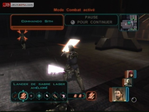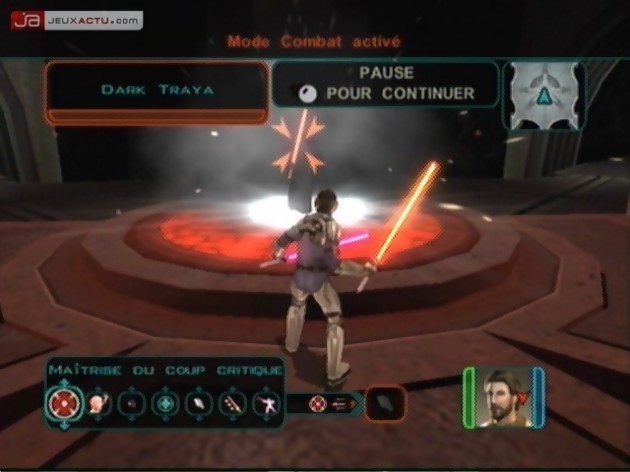 Un des problèmes du soft est sa balance. Une fois encore, KOTOR 2 fait la part belle aux combats au corps à corps et aux joueurs qui aiment bourriner. Si l’aventure s’avère être longue (une quarantaine d’heures de jeu), les combats sont vraiment portés sur le côté brut de décoffrage des choses. Evitez de créer un Jedi ayant des capacités orientées vers la dextérité et le combat au flingue et Privilégiez la force, le charisme et la sagesse. Ici, deux mots d’ordre s’imposent : la parole est au sabre laser (voir double sabre laser pour les grosses brutes) et à deux pouvoirs de la Force créant ainsi la différence (le Force Push, où comment rentrer dans une pièce en faisant chuter huit adversaires au sol, tout en les privant d’un tiers de leur santé vitale. L’autre pouvoir réside au niveau des éclairs du coté obscur rappelant Palpatine dans le Retour du Jedi. Donc, si votre groupe possède ne serait-ce que deux jedis (à trois, le jeu vire au massacre perpétré au sabre laser) avec leurs pouvoirs de guerrier et de magicien (possible de soigner ses troupes), les combats s’enchaîneront les doigts dans le nez d’un Hutt. Du coup, on fonce dans le tas et on ne surveille quasiment jamais sa barre de vie.