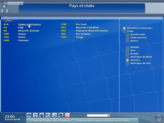 Après avoir défini votre plaisir, vous avez possibilité de prendre en main du club de votre choix parmi 26 championnats représentés. C’est autant que l’année précédente et c’est surtout moitié moins que Football Manager. Ne lui jetons pas non plus la première pierre, rare sont les joueurs à préférer lancer leur carrière dans un championnat exotique et ils sont encore moins nombreux à s’exercer à tous ceux proposés. Si la base de donnée se suffit à elle-même, elle tient également compte du mercato estival. Les principales ligues sont donc correctement mises à jour mais ils subsistent quelques erreurs dans les divisions inférieures. Certaines statistiques semblent un peu incohérentes voire fantaisistes et l’historique de bons nombres de joueurs est incomplet. Par contre, il est désormais possible d’être nommé sélectionneur d’une équipe nationale et cerise sur le cake, de cumuler les casquette entre cette fonction et celle d’entraîneur d’un club. Pour l’occasion, l’interface a été retravaillé et est mieux agencée. Gagnant en clarté, la navigation est simplifiée et on ne perd pas ainsi plusieurs minutes à chercher l’option qui nous intéresse comme c’était le cas auparavant. Bien que beaucoup plus colorée et bien plus accueillante que Football Manager, elle est grandement inspirée de ce dernier et ne se démarque pas vraiment.