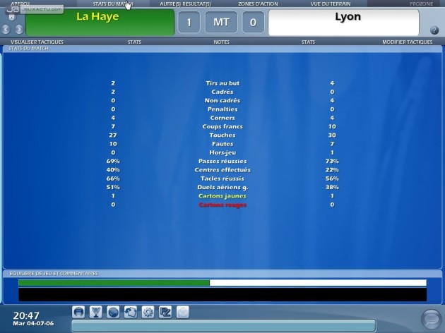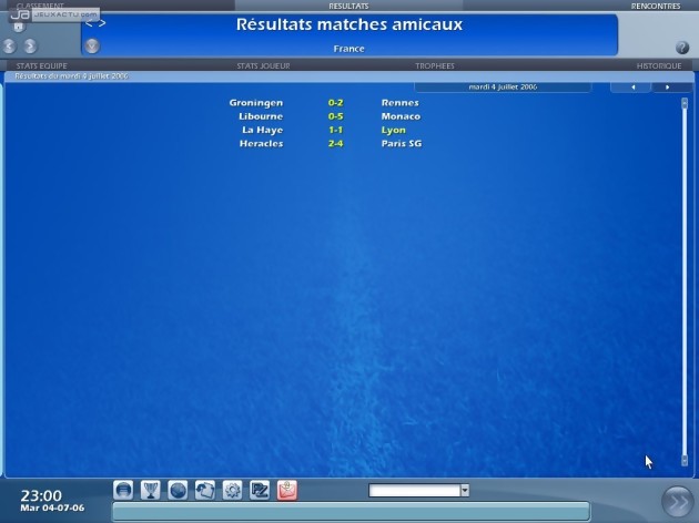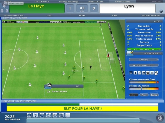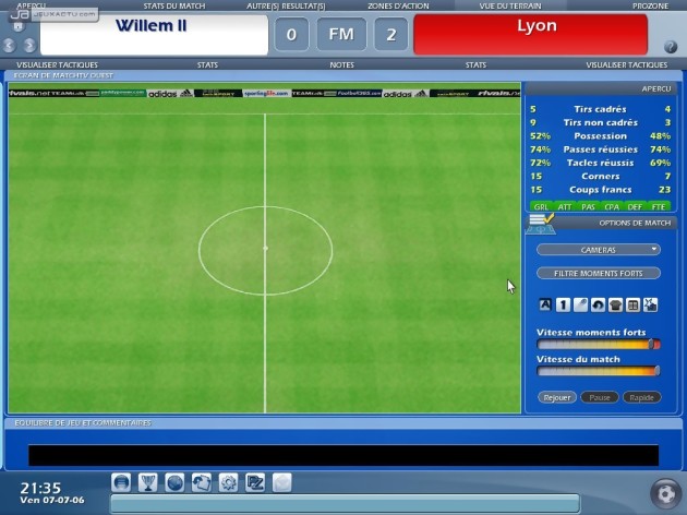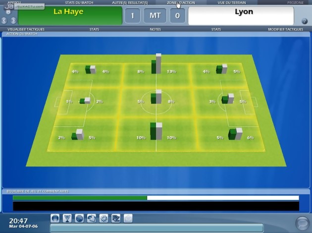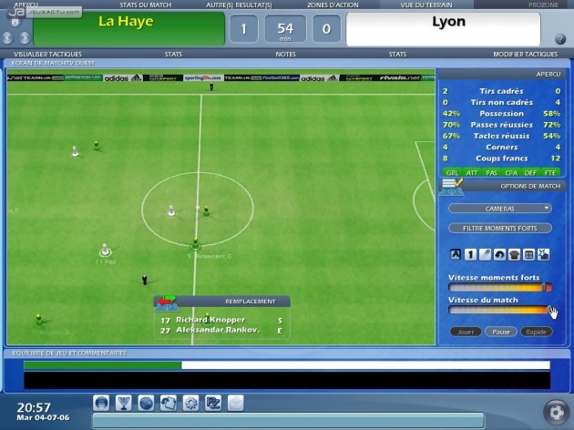 L’entraîneur 2006 ne nous avait pas laissé un souvenir impérissable et les développeurs ont peut-être pris en compte certains défauts pour leur étriper le coup. En tout cas, le coche semble raté pour le marché des transferts. En effet, les joueurs se laissent trop facilement happé par l’argent et peuvent même quitter une sélection prestigieuse pour aller exercer leur art dans un club de seconde catégorie. Si depuis l’année dernière, les matchs étaient représentés tout en trois dimensions – le rendu des joueurs étant plus ressemblants que des pièces de Subbuteo qu’autre chose mais cela n’est pas un reproche – on se souvient surtout qu’ils étaient souvent très brouillons et que de nombreuses actions de jeu frisaient l’incohérence. L’entraîneur 2007 a fait des progrès notables sur ce point. Comprendre par là que les rencontres ne sont plus aussi anarchiques. Une évolution qui s’accompagne de nouvelles options. Ainsi, il est possible de faire un discours à votre équipe avant, pendant et après le match qui aura un impact sur la motivation de vos poulains. Autant vous pourrez les motiver que provoquer un conflit. Le ProZone est une nouveauté particulièrement intéressante. Option désormais incontournable pour analyser les performances individuelles et collectives de son équipe, on peut revisionner certaines séquences du match en mettant bien en évidence certaines actions de son choix : l’évolution des lignes de défense adverse, les buts, les tirs, les têtes, les passes, etc. Des informations précieuses pour peaufiner sa stratégie et pour décider des joueurs titulaires.