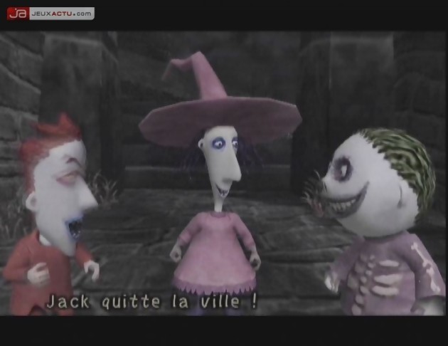 C’est donc pour le compte de l’Oncle Disney, alias Buena Vista Interactive, que le studio japonais a pour tâche de ressusciter plus de dix ans après le mythe du pumpkin king filiforme. Pour quel résultat ? Nous voici plongé à Halloween Town, un univers faussement sombre et gentiment macabre, dans lequel les squelettes pendus aux réverbères passent l’éternité en lisant un bon bouquin. Ce sera également l’occasion de croiser Zero le canidé qui n’a pas perdu une miette de son flair, même depuis qu’il est mort, un enfant mort-vivant jouant près de la fontaine, le docteur Finkelstein dont la boîte crânienne peut s’ouvrir à loisir pour lui permettre de se creuser les méninges littéralement, ainsi que le maire aux deux visages qu’il peut interchanger à volonté pour adapter sa mine aux circonstances. N’oublions pas la poupée de chiffon plus ou moins bien cousue dont les yeux globuleux ont flatté les orbites vides de Jack depuis le début.