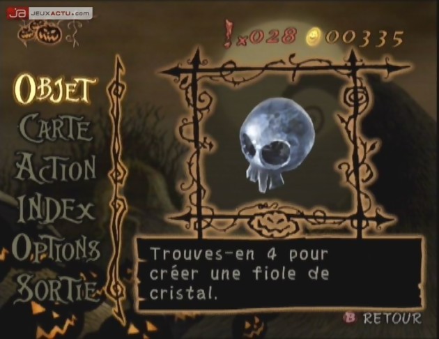 Jack est plutôt pacifiste, mais les développeurs de Capcom, studio familier aux titres d’action, lui ont attribué une arme particulièrement sympathique en la personne de la Soul Rubber. La voleuse d’âme consiste en une espèce de fouet en slime vert fluo qui peut se rétracter et changer légèrement de forme. Cette Soul Rubber est la clé de voûte de la progression de Jack qui s’en servira pour frapper violemment ses adversaires bien sûr, mais aussi pour s’agripper, actionner des leviers à distance, ou attraper un ennemi pour taper sur un autre. Si quelques variantes sont disponibles comme un coup tourbillonnant, on se retrouve rapidement à marteler bêtement le bouton d’action, les quelques ennemis n’opposant pas de résistance particulière, et le système de combat se voit réduit à sa plus simple expression. Quand bien même l’arme reste fort sympa à utiliser en soi, et peut éventuellement évoquer au début des grandes productions orientées action comme God of War. Mais seulement au début, hein. Jack disposera aussi par la suite de deux transformations, la première fera de lui le roi de la citrouille et lui permettra de cracher du feu, toujours utile pour calciner les matières inflammables et la seconde fera de lui un vrai Père Noël, avec la hotte remplie de cadeaux dont l’effet de surprise pourra être utile en quelques occasions. Pas fondamentalement difficile, il peut arriver d’être un peu perdu quant au prochain objectif à accomplir puisque les niveaux ne sont pas disposés de façon linéaire. Pas de panique, un indice est disponible en permanence dans le menu du jeu pour éviter de tourner en rond.