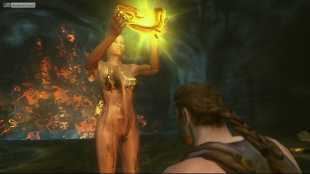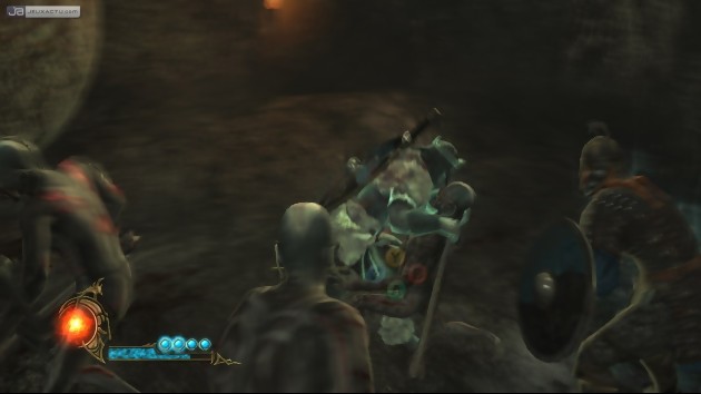 S’il est également adepte de la baston les testicules à l’air (dommage d’ailleurs que Tiwak n’est pas respecté à la lettre le combat face à Grendel), Beowulf excelle aussi dans l’art du combat à l’arme blanche. Epée, glaive, lance, fourche, hache et autres lames tranchantes, notre Danois n’hésite pas à pourfendre ses ennemis d’un geste brusque. A ces armes, il est possible parfois d’associer un bouclier, cassable lui aussi au bout d’un certain temps. Idéal pour se protéger des attaques ennemies, il permettent aussi de lancer des contres-attaques efficaces. Il existe donc plusieurs catégorie d’armes (à une ou à deux mains) et qui bénéficient chacune de leurs propres caractéristiques. A ce sujet, entre deux missions et un retour dans son havre de paix, il est possible de choisir le type d’armes et de boucliers avant chaque mission, mais aussi d’augmenter les performances de son personnage. Un côté RPG pas franchement indispensable mais plutôt bienvenu. Mais comme toutes les armes des Vikings, elles se dégradent au fil des combats et finissent d’ailleurs par rompre, obligeant le joueur à scruter l’horizon pour en dégoter une nouvelle. Heureusement, au fil de l’épopée, il est possible de débloquer des armes légendaires, plus résistantes et qui permettent d’infliger des dégâts encore plus importants. Les plus fainéants préfèreront voler directement une arme à l’ennemi après l’avoir agrippé. L’empoignade est l’une des techniques les plus brutales dans le jeu et qui permet d’achever un ennemi de manière efficace, mais surtout en gros plan. Il existe d’ailleurs plusieurs manières d’achever son adversaire, proposées en fonction des touches qui apparaissent à l’écran. Affaiblir, lancer, écraser, tous les moyens sont bons pour que chaque affrontement finisse dans un bain de sang ou dans un requiem d’os brisés. Kiffant. Coup de chapeau d’ailleurs aux développeurs qui sont parvenus avec brio à retranscrire toute la force et la lutte que l’on peut ressentir au moment de ces empoignades.