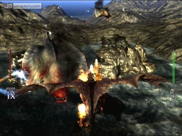 A cette confusion de la jouabilité s'ajoute une confusion de l'action. Les missions consistent bien souvent à détruire des cibles : catapultes, soldats, créatures fantastiques, éléments du décor... Seulement parfois, les objectifs ne sont pas bien clairs au milieu de dizaines, voire centaines d'unités à l'écran. Visuellement, les développeurs ont joué la surenchère, et c'est vrai qu'au début, ça impressionne, à la manière des combats du Seigneur des Anneaux. Mais encore faut-il savoir gérer tout ce petit monde ! Outre le fait qu'on n'identifie pas toujours bien ce qu'on doit attaquer (en pressant un bouton on peut afficher ses cibles en rouge, mais ce n'est pas très pratique quand on doit en plus bouger le pad et s'occuper des attaques), le moteur du jeu ne semble pas très bien supporter autant d'éléments à afficher, si bien que régulièrement, ça rame. Du coup, même si visuellement, malgré quelques faiblesses, ça peut paraître assez costaud, on reste sur une impression de médiocrité. Dommage ! Cracher du feu, c'est bien sympa mais notre dragon peut faire plus que ça ! En lockant un ennemi, il peut foncer dessus. Il s'agit ensuite soit d'appuyer sur les différents boutons pour le cramer ou le griffer par exemple, soit de se mettre à sa hauteur en orientant la manette puis la secouant dans sa direction pour le cogner. On a même droit, de temps à autres, à des petits Quick Time Events (QTE), pas très intéressants d'ailleurs... Mais globalement, l'action reste toujours floue, on a la dérangeante sensation que le hasard a son mot à dire, et donc d'être un peu exclu des affrontements, un comble !