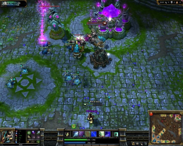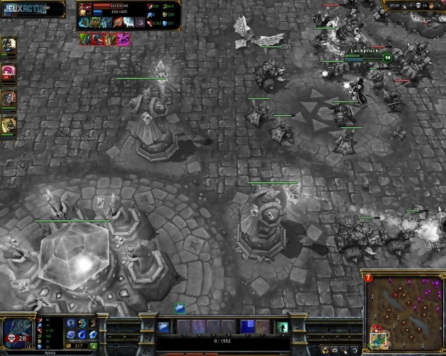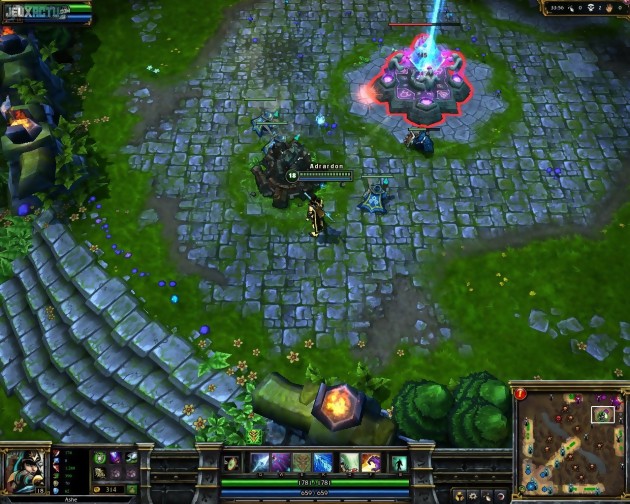 D'une partie à l'autre, il faut donc savoir renouveler ses stratégies et s'adapter en permanence à la situation du moment. Le changement de champion est une bonne manière de renouveler efficacement l'expérience de jeu et d'éviter toute routine. On en dénombre quarante, qui se jouent tous différemment puisqu'il sont dotés de sorts et capacités spécifiques. Tanks, unités de soutien, mages, archers, invocateurs... il y en a pour tous les goûts. En revanche, c'est clairement la disette en ce qui concerne les maps disponibles. Pour l'heure, les développeurs n'en proposent que deux, dont une est encore frappée de la mention "beta", signe qu'elle n'est peut-être pas encore tout à fait satisfaisante. Du coup, si les parties se suivent sans se ressembler en ce qui concerne le déroulement des combats, elles peuvent tout de même finir par lasser les joueurs les moins monomaniaques. La gratuité potentielle n'excuse pas tout, et nous sommes en droit d'espérer des arènes plus variées, aussi bien pour des questions d'ordre esthétique que stratégique. Gageons que de nouvelles maps verront le jour dans les mois à venir, et terminons par un mot sur le moteur graphique. Il a le bon goût de tourner sur des PC peu puissants et affiche des graphismes sympathiques... mais pas totalement enthousiasmants pour autant. L'influence de Warcraft III se ressent parfois un peu trop, et le surlignage des unités par un trait noir (façon Silverfall ou Borderlands) n'est pas toujours du meilleur effet. Mais heureusement, l'intérêt du jeu est vraiment ailleurs.