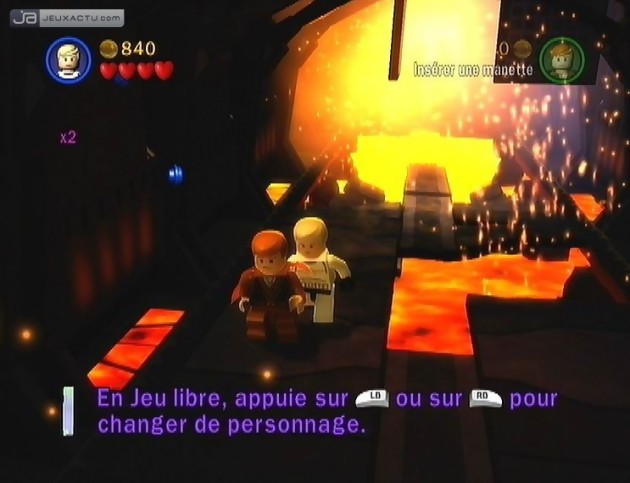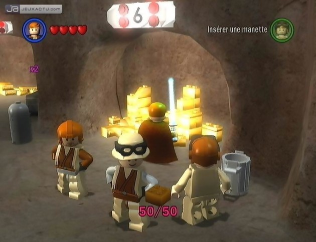 Et c’est chose faite ! Les développeurs de Traveller's Tales ont en effet compris qu’il manquait un certain dynamisme à leur LEGO Star Wars : Le Jeu Vidéo, titre basé sur les épisodes I, II et III de la série. Ainsi donc, "La Menace Fantôme", "L’Attaque des Clones" et "La Revanche des Sith" propose des phases de jeu beaucoup plus rapides, ce qui conviendra à tout un chacun et surtout à tous ceux qui sont tombés sous le charme de LEGO Star Wars II : La Trilogie Originale l’année dernière. La trilogie des années 1970 n’a, pour sa part, pas évolué d’un sou. On retrouve comme toujours Un Nouvel Espoir, l’Empire Contre-attaque et le Retour du Jedi divisé en six chapitres, oscillant entre phases de plates-formes pures, combats frénétiques aux sabre-lasers ou aux pistolets blasters, pilotage de X-Wing, Landspeeder ou Faucon Millenium. A contrario, ces séquences de jeu, moins nombreuses dans les trois premiers épisodes (chronologiquement parlant), ont également été améliorées. Difficile de ne pas penser aux courses de pod-racers du jeune Anakin Skywalker qui avait de quoi en énerver plus d’un en 2005. Courir contre la montre appartient désormais au passé. A ce jour, il faudra simplement se frotter au redoutable Sebulba tout en récupérant pièces, mini-kits et briques rouges pour qui veut terminer le jeu à 100%. Et ce n’est pas une mince affaire que de retourner LEGO Star Wars : La Saga Complète jusqu’au moindre pixel. Comme précédemment, le niveau de difficulté est plutôt faiblard et on enchaîne les épisodes sans aucun problème. Mais tout l’intérêt du titre de Traveller's Tales consiste à revisiter les niveaux avec des personnages inédits pour découvrir de nouveaux passages, mettre la main sur des objets rares et surtout vous gargariser de pièces d’or afin de tout dépenser dans la boutique du jeu. Même ici, vous ne serez pas au bout de vos surprises avec près de 128 personnages à débloquer, au fur et à mesure de l’histoire et en en achetant certains, une grosse dizaine de véhicules, des cheat codes et des vidéos à foison. Et pour qui en redemanderait, il est également possible de débloquer des niveaux inédits en fonction de votre progression. Et pour que le plaisir soit décuplé, les développeurs ont intégré un mode deux joueurs en coopératif comme pour LEGO Star Wars : Le Jeu Vidéo et LEGO Star Wars II : La Trilogie Originale. Mais sachez que cette fois-ci, il sera enfin possible de partir en voyage de noce sur Tatooine, Dagobah ou Kashyyyk en ligne. Malgré quelques petits problèmes de lag, cette option est la bienvenue et donne un regain d’intérêt à certains automatismes de jeu récurrents.