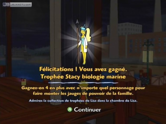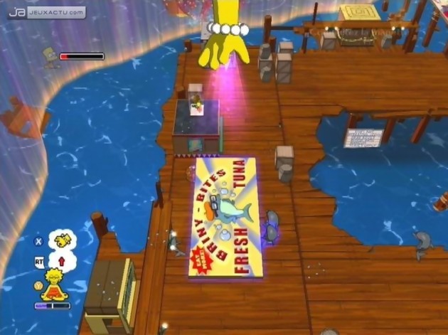 En ce qui concerne le gameplay, si on y regarde de plus près, c’est assez classique. On parcourt la plupart des niveaux en binôme formé parmi Homer, Marge (qui porte Maggie bien sûr !), Bart et Lisa. Homer peut roter ainsi que gonfler pour rouler et faire des super attaques, Lisa déplace de lourds objets grâce à la méditation et envoûte les ennemis à coup de saxophone, Bart est un as du lance-pierre, peut planer et utiliser un grappin grâce à sa panoplie de Bartman tandis que Marge, enfin, sait rallier des habitants à sa cause pour leur donner ensuite des ordres grâce à son mégaphone. Le jeu mêle plates-formes et action, et vous demande donc de faire collaborer les personnages pour franchir les obstacles. Donc original, peut-être pas, mais amusant, c’est certain ! Evidemment, le plaisir qu’on prend à jouer est fortement lié à tout ce que nous avons dit plus haut : si vous êtes hermétiques à l’univers des Simpson, vous serez sans doute moins captivé, mais après tout, un jeu de voiture pour qui n’aime pas les voitures serait tout aussi ennuyeux ! Mais que cela ne nous aveugle pas, il y a un vrai problème : la caméra. Rien d’insurmontable ou de terriblement rebutant, mais elle a parfois une fâcheuse tendance à se bloquer ou mal se placer, rendant certains passages plus difficiles qu’ils ne devraient l’être. Mention spéciale à la mission qui consiste à combattre Dodu Donut, la seule dont on puisse véritablement dire qu’on s’y ennuie tant la précision demandée dans les mouvements la rend pénible. Autre point noir à signaler, la durée de vie. A moins d’être un acharné prêt à collectionner tous les items cachés et remplir les défis contre la montre, l’aventure principale se termine en sept à huit heures, voire moins pour les plus doués. Ca paraît court (surtout si vous le faite d’une seule traite comme moi, mais on est fan des Simpson ou on ne l’est pas !), mais ce sont sept heures d’un bonheur total et très intenses. On n’aurait pas craché sur quelques missions en rab, mais il faut reconnaître que les développeurs ont déjà du sérieusement carburer pour remplir les existantes avec autant de situations, références, vannes et autres friandises…