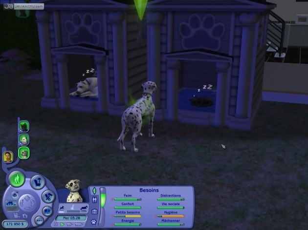 Mais passons sous silence ce que nous connaissons déjà pour nous consacrer à l’arrivée dans les foyers des bêtes à poils. Parmi la soixantaine de bestioles disponibles (chiens et chats confondus), il y en aura forcément une sur laquelle vous craquerez. Au début, comme avec un bébé, c’est l’enfer. Les chiens font des trous dans le jardin, les chats leurs griffes sur les canapés. Il convient donc de les gronder quand ils font des bêtises. Sinon, ils recommenceront sans cesse. Vos craintes ne sont bien entendu pas les mêmes que dans les autres disques additionnels, elles sont en rapport avec le contenu de ce disque. Si vous craignez que Médor ne s’en prenne au fauteuil en cuir et qu’effectivement il le fasse et c’est la chute libre au niveau du mental. Le psy ne va pas tarder à arriver. En étant laxiste, cette jauge qui était toujours au beau fixe dans le jeu de base finit très vite au plus bas. Il faut donc compenser en achetant quelques objets dédiés aux animaux (arbres à chat, niches, petits jouets…). Bien que les animaux n’aient ni aspirations ni craintes, ils ont cependant des besoins (les mêmes que les humains, excepté l’Environnement qui se transforme en Mâchonner / Griffer). Après quelques jours, les mauvaises habitudes auront entièrement disparues. Mais il conviendra de leur apprendre quelques tours de plus en plus impressionnants. A partir de ce moment-là, plusieurs possibilités s’offrent au propriétaire. Il peut fouiller parmi les petites annonces afin de trouver un job pour l’animal. Il évoluera parmi trois métiers (gardiennage, show-biz et services). Cela peut compenser le fait que le Sim soit seul à la maison et permet d’obtenir une manne d’argent de plus en plus conséquente. Encore plus tard, il sera possible de croiser des chiens par exemple pour obtenir chiots plus entraînés que leurs parents lorsque vous les avez accueilli. Le patrimoine génétique des différentes choses apprises se transmet à hauteur de 30%. Si les parents connaissent 5 tours chacun, donc 10 en tout, il existe de grandes chances pour que le chiot sache déjà faire trois choses dès son plus jeune âge. Et bien entendu, vous pouvez vous improviser dresseur pour obtenir une manne d’argent conséquente. 15 animaux peuvent cohabiter dans le même foyer.