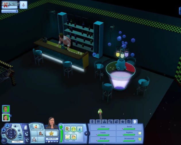 S'il était déjà possible d'incarner un guitar hero dans le jeu de base, les Sims 3 : Accès VIP se dote de nouveaux instruments de musique (contrebasse, batterie, piano) et de la possibilité de créer un véritable groupe. Il faut pour cela avoir une compétence suffisamment élevée dans l'un des instruments disponibles et aller recruter d'autres sims musiciens. Chaque groupe peut comprendre jusqu'à quatre membres, qui ne manqueront pas de répondre aux propositions de concert qu'ils recevront sur leur téléphone. Si vous n'avez que faire de la musique, il vous reste tout de même la possibilité de créer de simples bandes d'amis. Jusqu'à huit copains peuvent ainsi s'inviter les uns les autres à tel ou tel endroit, et certains lieux (théâtre, stade, spa...) disposent d'interactions spécifiques pour les bandes. Au rayon des fonctionnalités inédites, on trouve également le domestique, parfait pour nous débarrasser des tâches ménagères. Contre un salaire, le gîte et le couvert, cet homme élégant se charge des enfants, de la cuisine et du nettoyage. Autre chose : l'option "Convaincre de..." permet de suggérer certaines interactions sociales à deux sims, autres que le personnage que l'on dirige, afin qu'ils se rapprochent ou se détestent. La compétence de mixologie se destine quant à elle à ceux qui ont toujours jalouser Tom Cruise dans Cocktail. La création de boissons est un art qui offre bien des avantages : tout d'abord celui de travailler au noir dans les bars puis, une fois un certain niveau atteint, celui d'élaborer des recettes aux effets quasiment magiques (bonus d'humeur, gain de compétences, etc.). Et puisque l'on parle de surnaturel, comment ne pas évoquer l'arrivée des vampires dans cette extension ! Ces créatures de la nuit craignent naturellement le soleil, qui les affaiblit considérablement. Mais la nuit, ils disposent d'avantages non négligeables : déplacement à pied extrêmement rapide, vitesse d'amélioration de compétences augmentée, capacité de détection des proies aux alentours, pouvoir spécial pour lire dans les pensées des sims et apprendre beaucoup de choses sur eux à leur insu... Alléchant, non ? Hélas, la bien-pensance caractéristique des Sims à une nouvelle fois frappé. Passe encore qu'on ne puisse boire que des jus de fruits dans les boîtes de nuit, mais incarner un vampire qui doit impérativement demander l'autorisation à ses victimes potentielles de boire leur sang ou de les transformer, c'est un peu fort ! La toute-puissance en prend un coup et l'expérience manque finalement de piquant. Plutôt qu'essuyer sans cesse des refus, on finit par s'abreuver de poches de sang gardées au frigo ou, plus humiliant encore, par cultiver des plasmafruits. Oui, les créateurs des Sims ont inventé le concept du vampire pacifiste et végétarien. Pas très VIP pour le coup...
