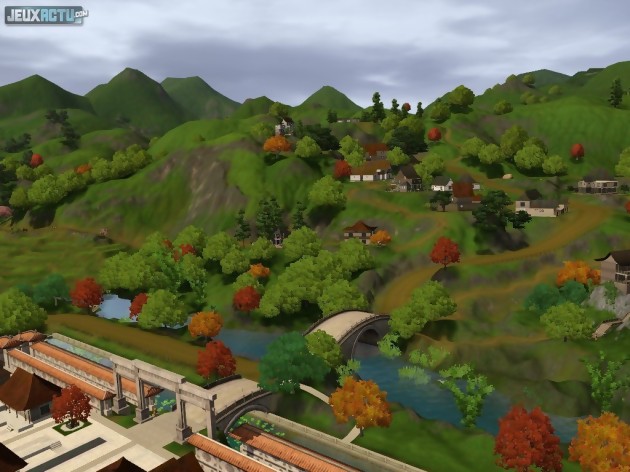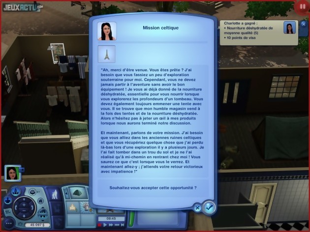 Une fois l'extension installée, vos Sims n'ont plus qu'à utiliser leur téléphone portable, leur téléphone fixe ou leur ordinateur pour avoir accès au planificateur de voyages. Cette nouvelle interface permet de choisir sa destination parmi les trois proposées : Shang Simla en Chine, Al Simhara en Egypte et Champs-les-Sims en France. On y détermine également la durée du séjour, qui se voit toutefois limitée par le type de visa que l'on possède actuellement. Sachant qu'un meilleur visa ne peut s'obtenir qu'en voyageant dans le pays concerné, on comprend vite qu'il faudra retourner plus d'une fois dans chaque destination. Enfin, il n'y a plus qu'à choisir d'éventuels compagnons de voyage. Le coût total de l'opération s'affiche alors et, si l'on possède suffisamment d'argent, un taxi vient immédiatement nous chercher. Un bon gros temps de chargement plus tard, voici les Sims téléportés dans le pays désiré. Dans un premier temps, le dépaysement est essentiellement esthétique puisque les pagodes de Chine, les pyramides d'Egypte et les maisons typiquement françaises n'ont pas grand chose à voir avec la banlieue américaine. Mais très vite, on se rend compte que le gameplay a également subi une franche refonte. Certes, même en voyage, il faut toujours gérer le quotidien des Sims et veiller à leur alimentation, leur sommeil, leur état d'esprit et leur hygiène. Pour cela, ils disposent initialement d'un camp de base qui contient le minimum vital (lit, toilettes...) et peuvent, à terme, acheter une résidence secondaire dans les parages. Et si les discussions avec les autochtones et les emplettes dans les marchés locaux ne sont en rien révolutionnaires, la présence d'un Tableau des aventures vient en revanche quelque peu bouleverser la routine du joueur. Il sert en effet de point de départ à toute une série de quêtes basées notamment sur l'exploration de lieux anciens.