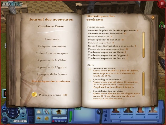 Muni de toutes ces nouveautés, les Sims 3 délaisse quelque peu son aspect bac à sable/maison de poupées pour se rapprocher d'un "vrai" jeu vidéo. Et l'on voit mal qui s'en plaindrait puisque le niveau de difficulté global n'est guère élevé. Même le jeune public pourra ainsi se frotter à ces nouveaux concepts. En guise d'aide supplémentaire, un journal des aventures regroupe de multiples informations sur les quêtes en cours, les reliques trouvées, le nombre de tombeaux explorés, etc. Et l'interface évolue légèrement grâce à la présence d'un onglet de suivi des aventures très pratique, qui nous indique l'objectif en cours et permet parfois de le résoudre par un simple clic (notamment lorsqu'il s'agit de ramener à quelqu'un un objet en notre possession pour boucler une quête). En revanche, il faut reconnaître que l'interface générale, initialement prévue pour des activités de construction, de planification et de discussions, n'est pas toujours parfaite pour les déplacements dans des lieux étroits et la recherche de mécanismes cachés. On passe parfois beaucoup de temps à se battre avec la caméra, ou à essayer de définir le sens dans lequel on désirer pousser une statue. Le tout n'est pas facilité par la gourmandise du moteur graphique, qui n'est définitivement pas fait pour les PC un peu anciens. Mais on passe facilement outre ces petits défauts, car la réussite est au rendez-vous partout ailleurs. Ainsi, l'ambiance des trois pays est très bien rendue, à coups de sympathiques clichés et de musiques locales : dragon sculptés et sonorités de xylophone en Chine, déserts, pyramides et mélodies orientales en Egypte, manoirs, dolmens et accordéon en France. Les Sims peuvent d'ailleurs apprendre auprès des autochtones quelques chansons locales, qu'ils n'auront de cesse de fredonner une fois rentrés à la maison. Les paroles de ces chansons sont bien sûr incompréhensibles, puisqu'en Simlish, mais on n'éprouve aucun mal à définir leur provenance, les phonèmes ayant été judicieusement choisis.