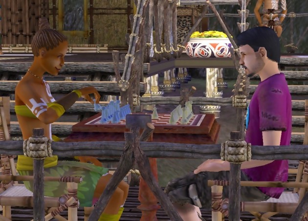 Une fois que son Sim a pris ses repères, celui-ci va devoir remplir des objectifs ou faire carrière, pour reprendre le terme employé dans le jeu. Il en existe trois dans le jeu et elle se distingue par leurs activités : fabrication, récolte ou chasse. Mais ce n’est pas tout ! Ramassez des fruits comestibles, couper du bois ou du bambou, partir à la pêche ou à la chasse, voilà en gros les occupations journalières de son Sim. En suivant le célèbre adage "le travail, c’est la santé", ce dernier va donc développer des compétences nécessaires à sa survie. Cuisine, mécanique, charisme, physique, logique, créativité, nettoyage, on a beau vivre au beau milieu de nowhere, les réflexes de la vie quotidienne reviennent au galop. En l’absence d’argent (ou plutôt de Simflouz), c’est par le biais du troc que nous êtres vont pouvoir s’échanger des marchandises et obtenir d’autres ressources. Tout une nouvelle manière de vivre se reconstitue au milieu de cette faune et flore qui permet de changer d’air. Si Les Sims : Histoires de Naufragés offre une bouffée d’air frais, grâce notamment à son environnement exotique, il n’en reste pas moins que la notion de survie sous-entendu par son titre et son concept est relayée au second plan. Parce que les aliments apparaissent en abondance et que la faune se montre pas franchement hostile, nos êtres vivent finalement leur vie sans avoir à craindre le danger ou le manque de nourriture. Il aurait été en effet bienvenue d’apporter davantage de challenge afin d’avoir le sentiment de revivre un épisode manqué de Koh-Lanta.