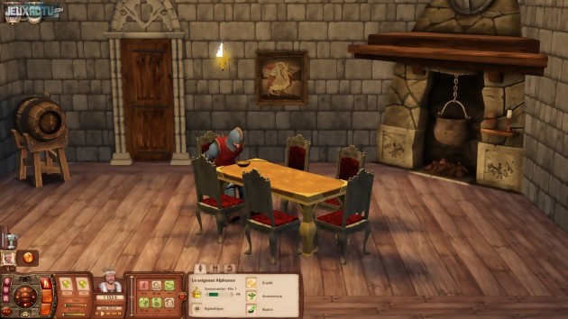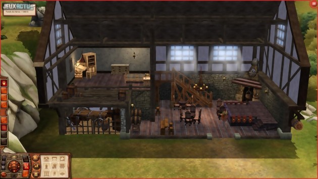 D'autres axes de liberté existent, puisqu'à l'intérieur d'une même quête dirigée par un même personnage, on nous demande régulièrement de choisir entre plusieurs manières d'arriver à nos fins. Hélas, tout cela ne change pas grand-chose au final car les quêtes sont divisées en nombreuses petites tâches qui diffèrent toutes sur le fond mais reviennent à effectuer la même chose sur la forme. Concrètement, une icône apparaît automatiquement sur le personnage ou le lieu concerné par la tâche. Même si ces derniers n'apparaissent pas à l'écran, l’icône reste visible pour le joueur. Généralement, il suffit alors de cliquer sur ce bouton puis de sélectionner l'option adéquate pour résoudre la tâche. On peut ainsi effectuer la plupart des quêtes au radar, en cliquant bêtement où on nous le dit, sans jamais chercher à comprendre ce qu'il se passe réellement. Faire de l'anti-jeu de cette manière n'a évidemment aucun intérêt, mais cela prouve que le gameplay se rapproche plus d'un jeu Facebook à la Farmville que d'une véritable expérience ludique. A l'usage, le jeu semble d'ailleurs avoir le séant entre deux chaises. On sent bien que les développeurs veulent nous offrir quelque chose de plus scénarisé qu'à l'accoutumée, mais l'interface et le principe "bac à sable" originels des Sims plombent quelque peu cette tentative. Il reste ainsi possible, et même obligatoire, de gérer la vie quotidienne du personnage que l'on contrôle. Heureusement, ses besoins ont été drastiquement réduits puisqu'il n'y a plus que deux barres à surveiller : la faim et la fatigue. Une grande victoire pour tous ceux qui ne supportaient pas de devoir accompagner leurs Sims aux toilettes toutes les deux minutes ! Reste que devoir interrompre une tâche en cours parce que notre chevalier ou notre espion tombe de fatigue ou d'inanition n'a pas grand-chose d'épique. Le fait que le souverain doive couper lui-même du bois ou ramasser des plantes a d'ailleurs également quelque chose de perturbant. On regrette aussi que certaines actions réutilisent le système de représentation des lieux de travail des Sims classiques. Comprenez par là que si vous vous aventurez dans la forêt ou encore dans une grotte, toute représentation graphique de votre héros cessera. S'il lui arrive quelque chose durant ce temps, ces évènements seront alors décrits par un simple texte affiché à l'écran. Un procédé de narration qui nous renvoie à la préhistoire du jeu vidéo. C'est d'autant plus regrettable que les interactions entre Sims donnent généralement lieu à de petites animations plutôt amusantes. En revanche, le moteur 3D fait par moments peine à voir, surtout lorsqu'il tente d'afficher des paysages, constitués de textures bien peu détaillées. De plus, la caméra ne se contrôle pas toujours aisément, tandis que la représentation des bâtiments n'est plus possible à 360°. Ils sont désormais affichés en coupe, comme des maisons de poupée, et la rotation de la caméra se retrouve partiellement bloquée afin de conserver en permanence un tel point de vue.  S'il part certainement d'une bonne intention (toute évolution de la série étant bonne à prendre), les Sims : Médiéval se retrouve finalement handicapé par une réalisation trop légère et un certain manque d'ambition.