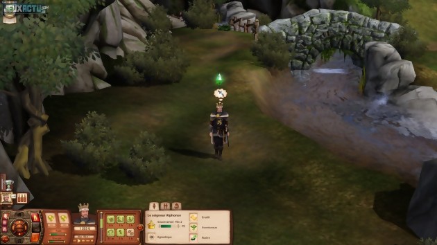 C'est décidé, voilà donc nos Sims plongés en plein Moyen-âge ! Les quartiers résidentiels typiquement américains ne sont évidemment plus de la partie, et c'est un véritable royaume qui s'offre à nous. En début de partie il est bien vide puisque seul le palais royal y est érigé. Par la suite, il vous appartiendra de bâtir un monastère, une caserne, un marché ou encore une tour de la sorcellerie grâce aux points de royaume gagnés au fil des quêtes. Mais avant cela, il convient de choisir un souverain parmi les personnages pré-configurés ou, mieux encore, d'en générer un tout nouveau tout beau grâce à l'option Créer un Sim. On retrouve alors un outil de création très proche de celui des Sims 3, la principale différence provenant du catalogue des vêtements disponibles. Dites adieu aux habits modernes, ainsi qu'au maquillage bizarrement, et bienvenue aux tenues d'époque. Ce qui ne risque pas de faire évoluer la réputation de "jeu pour petites filles" qui colle aux Sims, car les robes de princesse se taillent plus que jamais la part du lion. Une fois notre roi ou notre reine créé(e), on dispose d'un premier crédit de 1000 Simflouz à dépenser dans le mode Meubles. Une fois de plus, seuls des objets d'époque sont disponibles, ce qui restreint beaucoup les possibilités par rapport à un épisode standard des Sims. Autre changement très important, on ne préside plus du tout à la destinée d'une ou plusieurs familles de Sims. Nos héros ne vieillissent pas, et la plupart des quêtes peuvent être résolues en ne contrôlant qu'un seul personnage à la fois. Et en tout, seuls dix héros différents peuvent être créés, chacun correspondant à un poste bien précis du royaume. Nous avons donc le souverain, le chevalier, le marchand, le barde, le prêtre jacoban, le prêtre pétérien, l'espion, le sorcier, le médecin et le forgeron. Selon les quêtes qu'on choisira de remplir par la suite, on contrôlera donc l'un ou l'autre de ces personnages, sachant que la résolution de certaines missions différera sensiblement selon le protagoniste retenu. Un barde ou un chevalier ne procéderont par exemple pas de la même manière pour étouffer une révolte de paysans.
