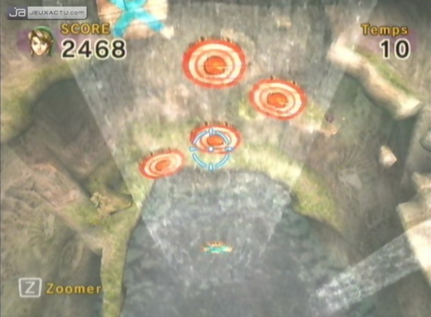 A l'instar du combo bleeding de The Club, un multiplicateur reprend le nombre d'ennemis abattus successivement. Plus docile que le titre de Bizarre Creations, et nettement moins hardcore, Link's Crossbow Training ne contraint pas le joueur à aligner les frags à la vitesse de la lumière, puisque le coefficient est conservé jusqu'à la prochaine cible éliminée, sans limite de temps. La précision est donc de mise, et même s'il est difficile de parler de headshot ici, le jeu récompense les joueurs qui font preuve d'une acuité visuelle extrême en leur accordant plus de points. On dispose d'autres moyens pour claquer le high score, comme viser en priorité les cibles dorées, ou bien mitrailler certains éléments destructibles du décor - vases, rupees, épouvantails - omniprésents, quelle que soit la mission. Il en existe d'ailleurs trois types : le tir sur cibles, la défense, et l'assaut. Le tir sur cible est on ne peut plus basique, puisqu'il s'agit de tirer sur les panneaux de bois qui apparaissent successivement à l'écran. Pour tromper le joueur, certaines cibles fictives - croix bleue ou autres - viennent se faufiler dans l’espoir de faire perdre des points. La mission défense présente un tout autre challenge, puisqu’il faut cette fois protéger sa carotide des crocs ennemis, un radar en bas de l’écran permettent de mieux les visualiser. Ici, on ne se déplace pas, et seules les cervicales travaillent. En tirant sur un ennemi entouré d'un halo vert lumineux, on peut même profiter d'une arbalète-mitraillette qui permet d'abattre un tas de monstres de façon plus efficace. Dans cette configuration, les munitions sont bien évidemment comptées, et la cadence normale revient au bout de quelques secondes. Enfin, l'assaut permet de se déplacer dans des zones de taille restreinte, mais dans lesquelles on peut avoir du mal à situer quelques sbires, même avec le radar. C'est aussi l'occasion de profiter du zoom, plutôt discret jusqu'à présent, et qui s’avère rapidement indispensable pour flinguer les Moblins perchés en haut des tours.