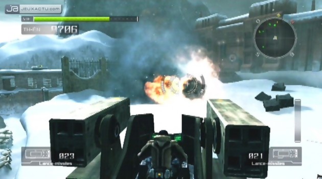 Toujours aussi ingénieux et surtout fainéant, l’Homme a eu la présence d’esprit de fabriquer des Vital Suits, appelés VS dans leur jargon. Ces robots qui font une fois encore référence au film de Ridley Scott, permettent à la fois d’augmenter la puissance de frappe mais aussi de se protéger des attaques frontales des Akrids, capables de balayer n’importe quel Humain d’un simple revers de griffes. Il existe plusieurs variétés VS dans le jeu et Wayne aura parfois le lourd fardeau de choisir entre un robot à la détente plus généreuse mais à la force de frappe amoindrie ou un VS plus lent mais plus puissant ; en attendant l'ultime VS de fin de niveau, comparable à un mech de Zone of The Enders. Vous l’avez compris, chaque type de VS se distingue par des caractéristiques bien distinctes. Tout comme Wayne, ces mechs surpuissants peuvent être équipés de deux types d’armes différentes, à placer de part et d’autres de ces machines. Là aussi, les munitions sont légions et laisser le doigt appuyé sur la gâchette ne pose pas vraiment de problème. La présence et l’utilisation de ces VS procure une sensation de puissance inégalée, d’autant que Lost Planet se présente avant tout comme un jeu d’action où l’on réfléchit après avoir ouvert le feu ou pendant, ça dépend. A cela s’ajoute un autre élément, apparaissant comme l’une des subtilités du gameplay. Wayne, évoluant dans un climat polaire ubiquiste, il doit en permanence surveiller sa jauge de Thermo-Energie en constante chute, due au froid polaire qui règne sur la planète. Cette jauge de Thermo-Energie n’est autre que l’assurance de vie de Wayne qui, une fois vidée, entraînera la chute de sa barre de vie, engendrant inexorablement sa mort. Mais c’est sans compter sur la foultitude d’ennemis et d’Akrids laissant traîner quelques gouttes de cette Thermo-Energie pour maintenir sa forme olympique.