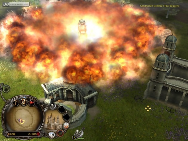 Ce nouvel opus apporte également des mécanismes un peu différents. Souvenez-vous : il n’était pas vraiment possible de mettre en place le camp de vos rêves. Vous possédiez en effet un énorme château dans lequel vous placiez au maximum 8 ou 12 structures (archerie, fermes pour la collecte des ressources, bâtiments d’amélioration…). Maintenant, tout parait beaucoup plus ouvert, avec cependant quelques contraintes. Bien entendu, il est impossible de construire sur un terrain trop accidenté, cela reste logique. En ce qui concerne les fermes, il demeure très maladroit des les placer les unes à côté des autres. En effet, en les plaçant, vous verrez un cercle se former autour de ce bâtiment. Au centre, vous verrez un pourcentage d’efficacité. S’il n’y a aucun bâtiment aux alentours, si le terrain est bien plat, vous obtiendrez un rendement de 100%. En revanche, lorsque deux cercles de ferme se chevauchent, ça baisse. Cette règle apporte une grande modification de gameplay. Vous ne devrez plus rester cloîtré en sein d’une forteresse et placer un maximum de trébuchets ou de tours de gardes sur les murs mais protéger de nombreux lopins de terre éparpillés, faire face sur de nombreux fronts à la fois. Le jeu ne se résume donc plus à des attaques ou des défenses de forts. On gagne en rythme et en intérêt. Les parties personnalisées revêtent de nombreuses formes. Entamer la conquête globale impliquera de votre part plusieurs jours de jeu et la prise des capitales quelques heures. Vous passerez pas mal de temps sur la carte du monde, à affiner vos petites armées, comme sur un Risk en essayant de trouver l’alchimie idéale entre les héros et les armées disponibles au départ. Une fois une campagne terminée, rien ne vous empêche de changer de race, histoire de goûter un gameplay différent. Ne vous faites pas trop d’illusion cependant : les mécanismes du jeu d’un camp à l’autre ne sont pas différents. Une fois de plus, ce sont les héros qui se distinguent les uns des autres, pas les races.