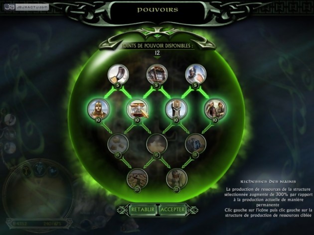 Ce nouvel opus apporte également des mécanismes un peu différents. Souvenez-vous : il n’était pas vraiment possible de mettre en place le camp de vos rêves. Vous possédiez en effet un énorme château dans lequel vous placiez au maximum 8 ou 12 structures (archerie, fermes pour la collecte des ressources, bâtiments d’amélioration…). Maintenant, tout parait beaucoup plus ouvert, avec cependant quelques contraintes. Bien entendu, il est impossible de construire sur un terrain trop accidenté, cela reste logique. En ce qui concerne les fermes, il demeure très maladroit des les placer les unes à côté des autres. En effet, en les plaçant, vous verrez un cercle se former autour de ce bâtiment. Au centre, vous verrez un pourcentage d’efficacité. S’il n’y a aucun bâtiment aux alentours, si le terrain est bien plat, vous obtiendrez un rendement de 100%. En revanche, lorsque deux cercles de ferme se chevauchent, ça baisse. Cette règle apporte une grande modification de gameplay. Vous ne devrez plus rester cloîtré en sein d’une forteresse et placer un maximum de trébuchets ou de tours de gardes sur les murs mais protéger de nombreux lopins de terre éparpillés, faire face sur de nombreux fronts à la fois. Le jeu ne se résume donc plus à des attaques ou des défenses de forts. On gagne en rythme et en intérêt. Les parties personnalisées revêtent de nombreuses formes. Entamer la conquête globale impliquera de votre part plusieurs jours de jeu et la prise des capitales quelques heures. Vous passerez pas mal de temps sur la carte du monde, à affiner vos petites armées, comme sur un Risk en essayant de trouver l’alchimie idéale entre les héros et les armées disponibles au départ. Une fois une campagne terminée, rien ne vous empêche de changer de race, histoire de goûter un gameplay différent. Ne vous faites pas trop d’illusion cependant : les mécanismes du jeu d’un camp à l’autre ne sont pas différents. Une fois de plus, ce sont les héros qui se distinguent les uns des autres, pas les races.