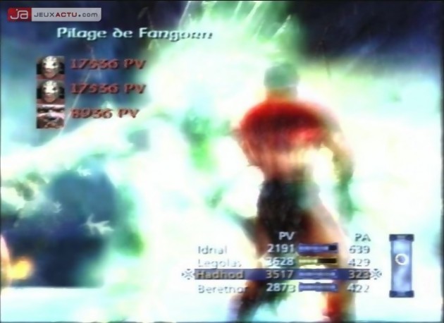 Le point de départ du Tiers Age se situe à l’époque de La communauté de l’anneau et aux prémices donc de l’affrontement épique entre les sbires de Saroumane et les potes de Gandalf. Après une intro en vidéo, nous voilà donc prêt à aller croiser le fer avec de l’orque ou de l’ourouk mais une première déception pointe immédiatement le bout de son nez : on n’incarne pas un héros du livre/film mais Berethor, un obscur garde de la citadelle du Gondor ! Et pourquoi pas le comptable de Hobbitbourg ou l’aubergiste du Poney Fringant… D’emblée, on se contrefiche de ce qui va donc pouvoir arriver à notre héros tout comme à ceux qui vont l’accompagner au fil de ses rencontres : Idrial de la Lothlorien, Elegost des Dunedain (un ersatz d’Aragorn), Hadhod (une caricature de nain), Morwen du Penmark et enfin, Eaoden du Riddermark. Nul besoin de signaler que chacun d’entre eux a ses propres spécificités comme dans tout jeu de rôle qui se respecte. A la manière d’un Final Fantasy VII, par exemple, vous ne contrôlerez, lors de la plupart des combats, que trois de vos personnages à choisir parmi les six disponibles. Tout comme dans FF7, d’ailleurs, une jauge, une fois remplie, vous permettra de déclencher un super coup. Seule différence, cette jauge augmentera en fonction des coups que vous porterez et non de ceux que vous prendrez et ce, de manière groupée et non individuelle comme dans le hit de Square. Tant qu’on est dans l’univers FF, restons-y puisque Le Tiers Age propose également un système de combats aléatoires sur les cartes que vous traversez. Tant qu’à s’inspirer (copier ?), autant le faire à partir des références du genre, me direz-vous. Mouais, vous rétorquerai-je d’une moue désabusée, c’est surtout là que s’arrête la ressemblance avec le mythique Final Fantasy VII. On ferme le ban et on passe à un autre paragraphe.