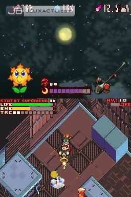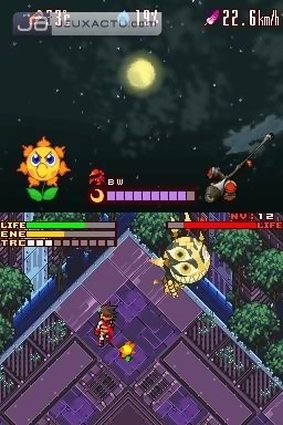 L’opposition entre les deux protagonistes principaux se retrouve logiquement dans leurs capacités respectives. L'un adepte du corps à corps possède l'épée des Ténèbres, l'autre faisant dans la joute à distance, combat à l’aide d’un Solar Gun. Le tout étant articulé autour des conditions climatiques, réunies pour l’occasion sur l’écran supérieur de la console. Tout le concept de Boktai, qui voulait qu’une multitude de mécaniques de jeu découlent directement de l’intensité de la lumière, est ici simulé. Désormais simple composante du gameplay pour une plus grande souplesse et de meilleures conditions de jeu, Lunar Knights préserve néanmoins l’esprit de la série tout en l’approfondissant. Température, humidité, force du vent et saisons seront d’autres variantes avec lesquelles il faudra savoir composer. Par exemple, si c’est au contact des rayons solaires qu’Aaron recharge son énergie, Lucian lui aura besoin de la lumière du clair de lune. A vous d’agir en conséquence pour ne pas rendre Aaron inutile sachant que chaque coup de feu tiré lui coûtera des points d’énergie. En sus du cycle jour/nuit s’ajoute la gestion classique mais ô combien importante des forces élémentaires. Fonctionnant encore une fois par complémentarité, elles seront incarnées par les Terreniens, esprits affiliés à une puissance naturelle que vous débloquerez au fur et à mesure de votre avancée.