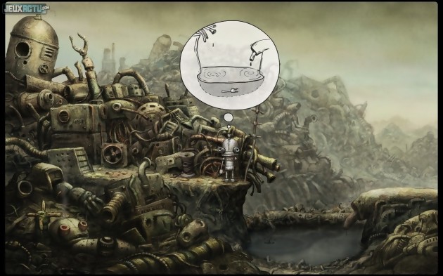 Dès le premier lancement, le joueur averti détectera les signes d'un jeu particulièrement soigné. Ainsi, le logo Machinarium qui nous accueille est interactif. Chacune de ses lettres s'anime et se déforme au passage du curseur de souris. Mieux encore, le menu principal et animé auquel nous avons droit par la suite correspond en fait à la première scène du jeu. Une fois qu'on clique sur "nouvelle partie", la transition avec le gameplay s'effectue alors forcément en douceur. Ces petits détails prouvent non seulement que les développeurs ont l'amour du travail bien fait, mais permettent également de nous faire profiter sans attendre de la patte graphique du jeu, aussi spécifique que séduisante. Les tons pastels de cette 2D "peinte à la main" ne peuvent que charmer les esthètes. De plus, ils s'accordent parfaitement avec l'univers robotique, mélancolique et partiellement désenchanté qui sert de cadre au jeu. On y incarne un robot bon pour la casse, et violemment séparé de sa petite amie. La première énigme consistera d'ailleurs à récupérer et réunir les différentes parties de notre corps afin de pouvoir progresser plus sereinement. A lui seul, ce tableau initial suffit pour prendre conscience des nombreux atouts de Machinarium. On découvre ainsi un gameplay relativement singulier, puisqu'il ne sert à rien de balayer l'écran à la recherche des zones interactives. Pas question non plus de les afficher toutes grâce à une commande dédiée, comme c'est désormais la norme dans les jeux d'aventure. Les développeurs ont choisi une voie totalement opposée, et plutôt réaliste, puisqu'il n'est possible d'interagir qu'avec ce qui se trouve à portée de main du robot. Pour savoir si tel objet est ramassable ou activable, il va falloir s'en approcher ! Ce système aurait pu s'avérer particulièrement laborieux mais, à l'usage, il n'en est rien. Les objets interactifs ne sont pourtant pas particulièrement mis en valeur graphiquement. Ils sont au contraire parfaitement intégrés aux décors. Mais, bizarrement, on n'hésite jamais longtemps sur ce qu'il est possible de faire ou ne l'est pas. Ce tour de force provient certainement de la grande cohérence de l'univers représenté et d'un level design minutieusement réfléchi.