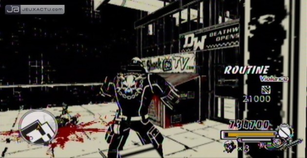 Un mot enfin sur la violence du jeu. Comme souvent dans pareil cas, MADWORLD risque de faire parler de lui dans les cercles bien pensants qui osent encore affirmer que le jeu vidéo est responsable de bien des maux de la société. A l'instar de The House of the Dead : Overkill (et son Guinness World Record du jeu vidéo contenant le plus de fois le mot "Fuck", 187 en tout), MADWORLD est à prendre au second degré. Car si la violence est outrageusement présente à l'écran (le rouge sang ressortant complètement dans cet univers bi-chrome), elle est loin d'être dérangeante, malveillante ou sournoisement dissimulée derrière un concept putassier. Le titre de SEGA, en assumant pleinement son statut de défouloir, est à ranger dans une catégorie du slapstick, pas plus méchant et dérangeant que fut Doom à son époque (ou Braindead par exemple, pour prendre un exemple sur un autre médium). D'ailleurs, les développeurs ont eu la bonne idée de donner une grosse dose d'auto-dérision à leur affaire, en proposant un duo de commentateurs venant lancer des blagues potaches à chaque action de Jack. Ca ne vole jamais haut, c'est souvent pas très fin, voire carrément vulgaire par moment, mais ça a le mérite de donner le ton à ce qu'est véritablement MADWORLD, à savoir un beat'em all bourrin qui n'a d'autre prétention que celle d'amuser en cassant du méchant. Rien de subversif donc…
