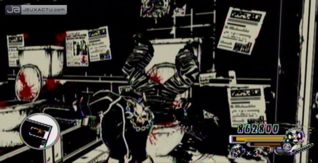 En plus de son background sombre, MADWORLD dispose aussi et surtout d'une réalisation globale très soignée. Les graphismes tout d'abord, se montrent vraiment très détaillés et utilisent à bloc toutes les capacités de la Wii, en proposant des personnages parfaitement modélisés et animés ainsi que des décors fouillés (le niveau du casino est assez impressionnant de ce point de vue d'ailleurs). Conséquence : des ralentissements se mettent alors à plomber l’ambiance s'il y a un nombre trop élevé d'ennemis à l'écran. Rien de comparable néanmoins avec ceux de The House of the Dead : Overkill. Côté maniabilité, on notera un gros effort de la part de Platinum Games qui a réussi à utiliser les points forts de la console (sa manette) pour rendre l'expérience MADWORLD aussi physique que sensorielle. Vous pourrez donc cogner vos ennemis soit en vous servant des boutons A (coups de poing) et B (coup de tronçonneuse), soit en agitant la Wiimote de bas en haut ou de gauche à droite (et avec les armes secondaires, vous découvrirez une nouvelle gamme de coup). Lorsqu'un ennemi est à terre, vous aurez le loisir de lui porter un coup de grâce avec une vaste gamme de QTE, utilisant parfaitement le capteur de mouvements de votre télécommande (du simple coup de poignet au gros 360°). Le tout se fait de manière forte instinctive, et grâce à un excellent tutorial en début de jeu, le joueur saura parfaitement contrôler Jack en un rien de temps. On aurait certes souhaité quelques possibilités de gameplay supplémentaires (comme par exemple pouvoir taper un ennemi que se trouve derrière soi), mais nous ne pouvons que nous incliner face à la prise en main rapide et efficace du jeu. Seul bémol dans tout ça, la gestion de la caméra parfois hasardeuse avec un système de "lock" pas très bien pensé et qui nous joue souvent des tours. Enfin, nous avons été conquis (et le mot est faible) par l'énorme bande-son du jeu, mélange musclé de hip-hop/fusion/funk/horror-core, qui révèle des talents tels que Ox, Doujah Raze, Sick YG, Bandy Leggz, Wordsmith, S.O.U.L. Purpose ou encore Optimus. Pour les petits curieux, ils possèdent tous une page Myspace ! Avis donc aux intéressés.