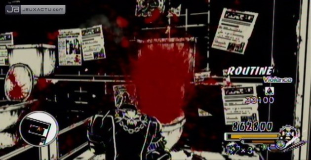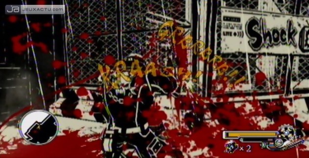 Un mot enfin sur la violence du jeu. Comme souvent dans pareil cas, MADWORLD risque de faire parler de lui dans les cercles bien pensants qui osent encore affirmer que le jeu vidéo est responsable de bien des maux de la société. A l'instar de The House of the Dead : Overkill (et son Guinness World Record du jeu vidéo contenant le plus de fois le mot "Fuck", 187 en tout), MADWORLD est à prendre au second degré. Car si la violence est outrageusement présente à l'écran (le rouge sang ressortant complètement dans cet univers bi-chrome), elle est loin d'être dérangeante, malveillante ou sournoisement dissimulée derrière un concept putassier. Le titre de SEGA, en assumant pleinement son statut de défouloir, est à ranger dans une catégorie du slapstick, pas plus méchant et dérangeant que fut Doom à son époque (ou Braindead par exemple, pour prendre un exemple sur un autre médium). D'ailleurs, les développeurs ont eu la bonne idée de donner une grosse dose d'auto-dérision à leur affaire, en proposant un duo de commentateurs venant lancer des blagues potaches à chaque action de Jack. Ca ne vole jamais haut, c'est souvent pas très fin, voire carrément vulgaire par moment, mais ça a le mérite de donner le ton à ce qu'est véritablement MADWORLD, à savoir un beat'em all bourrin qui n'a d'autre prétention que celle d'amuser en cassant du méchant. Rien de subversif donc…