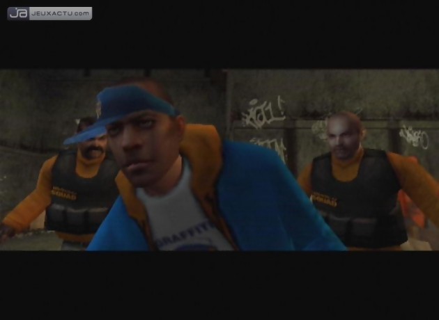 Il faut absolument couper court à cette comparaison avec GTA. Entendons nous bien, si les deux titres promeuvent la culture urbaine et une certaine liberté d'action, leur similitude s'arrête là. Ainsi, Getting Up s'architecture autour de plusieurs niveaux. Tombant sous le coup de la linéarité, le champ d'action est nettement plus restreint que celui d'une ville et on aura parfois la frustration de se cogner contre les fameux murs invisibles. D'un autre côté, il s'agit d'un mal pour un bien puisque cette orientation a permis de renforcer le caractère immersif du jeu. En effet, les développeurs ont accompli un énorme travail d'ambiance. Le level design est somme toute plutôt bon, les personnages sont charismatiques et la progression du jeu s'accompagne d'une bande sonore qui déchire. Wesh ! Pour ainsi dire, le doublage est particulièrement convaincant et la play-list accueille de grands noms de la scène hip hop. On pourra même écouter les pistes de son choix via l'intermédiaire de son iPod et débloquer de nouveaux tubes durant la partie. Par ailleurs, les menus sont très soignés et les différentes œuvres dans le jeu le sont tout aussi sympathiques. Rien à redire non plus du côté des animations des personnages (si ce n'est peut-être que Trane saute comme un pingouin asthmatique). Seulement, la réalisation pêche un petit peu lors de certaines occasions. Sujet à quelques ralentissements sur PS2,